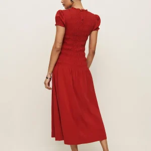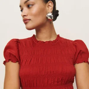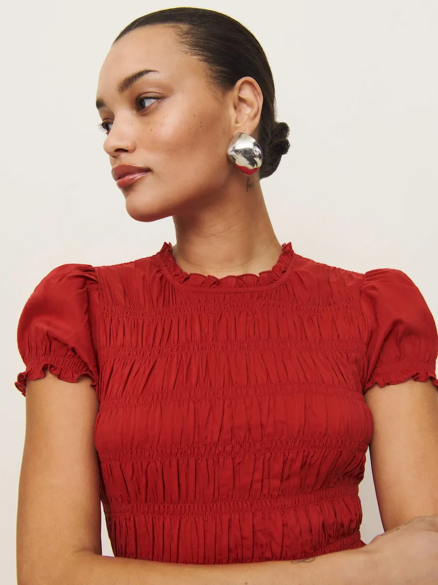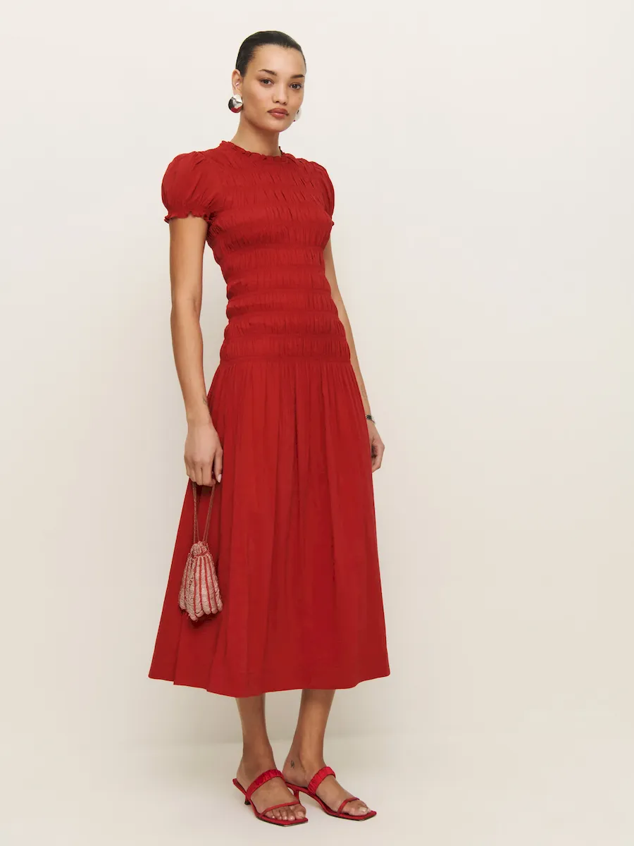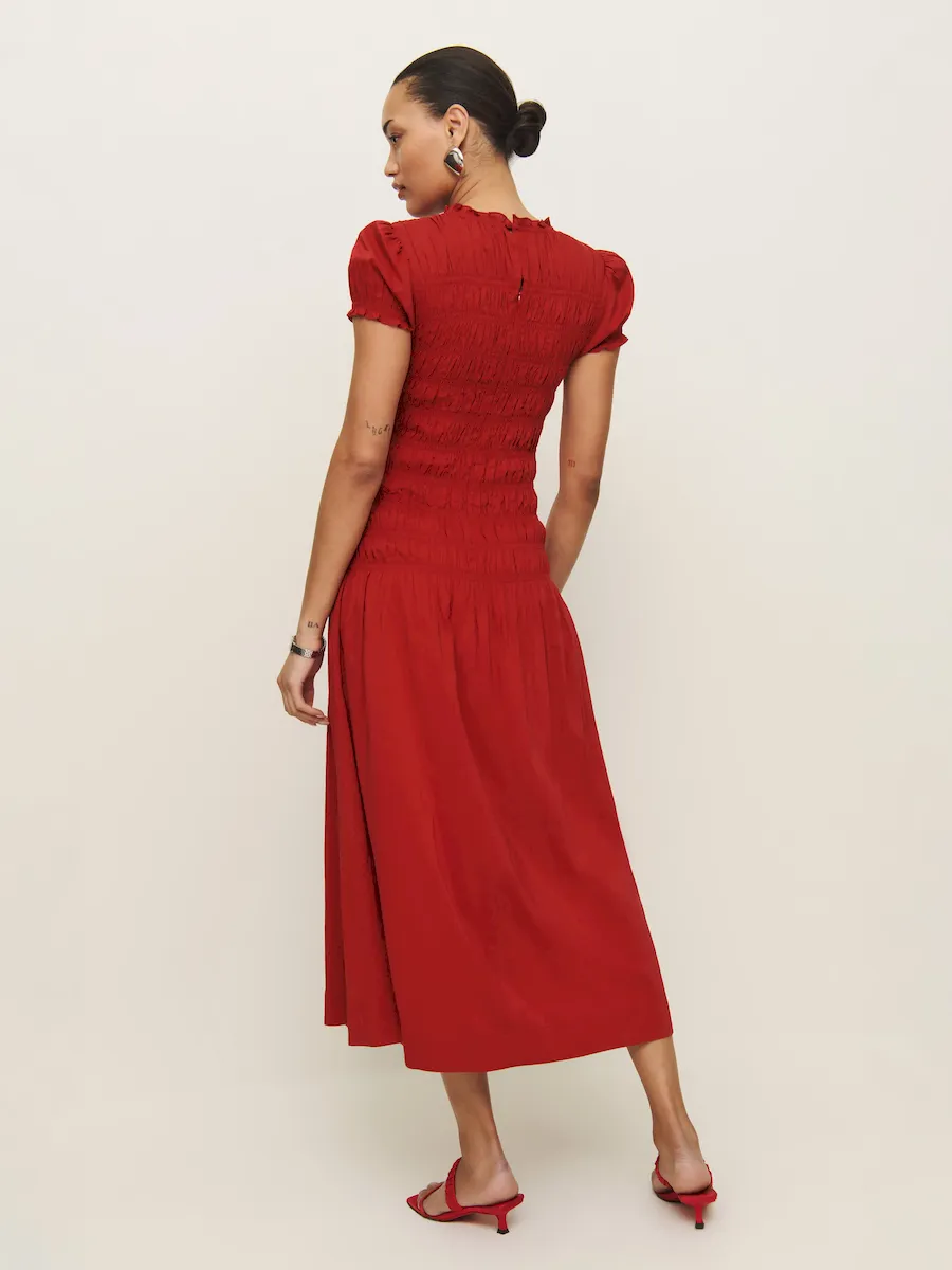 full bodice smocking, crew neckline.