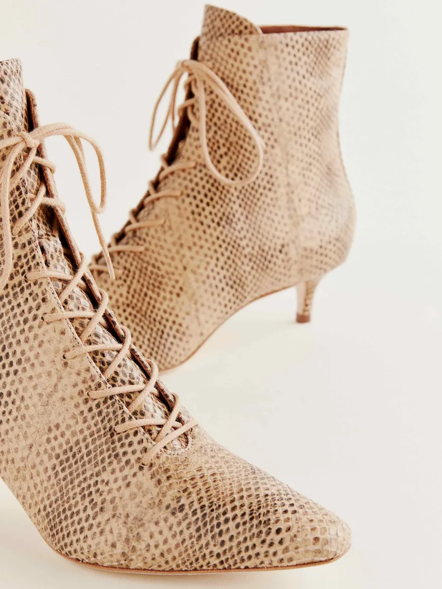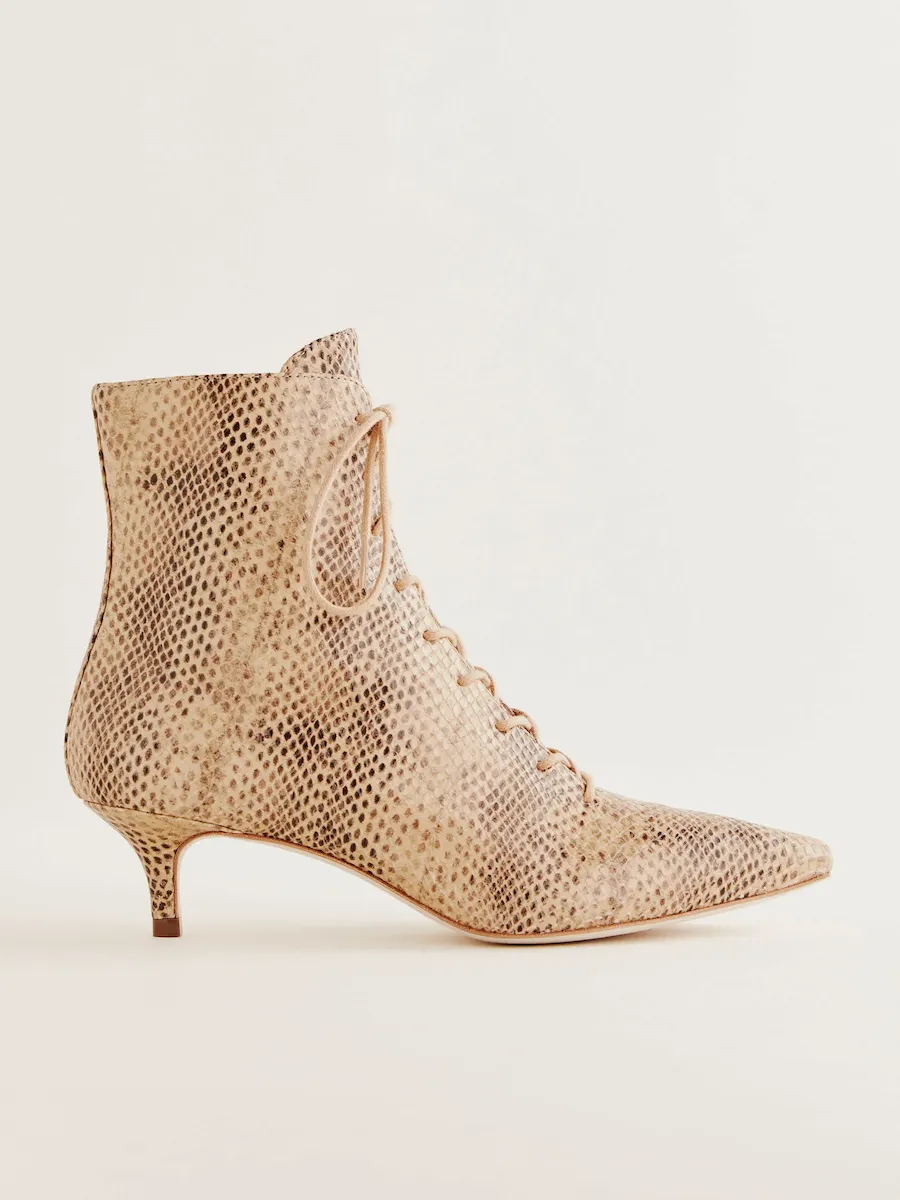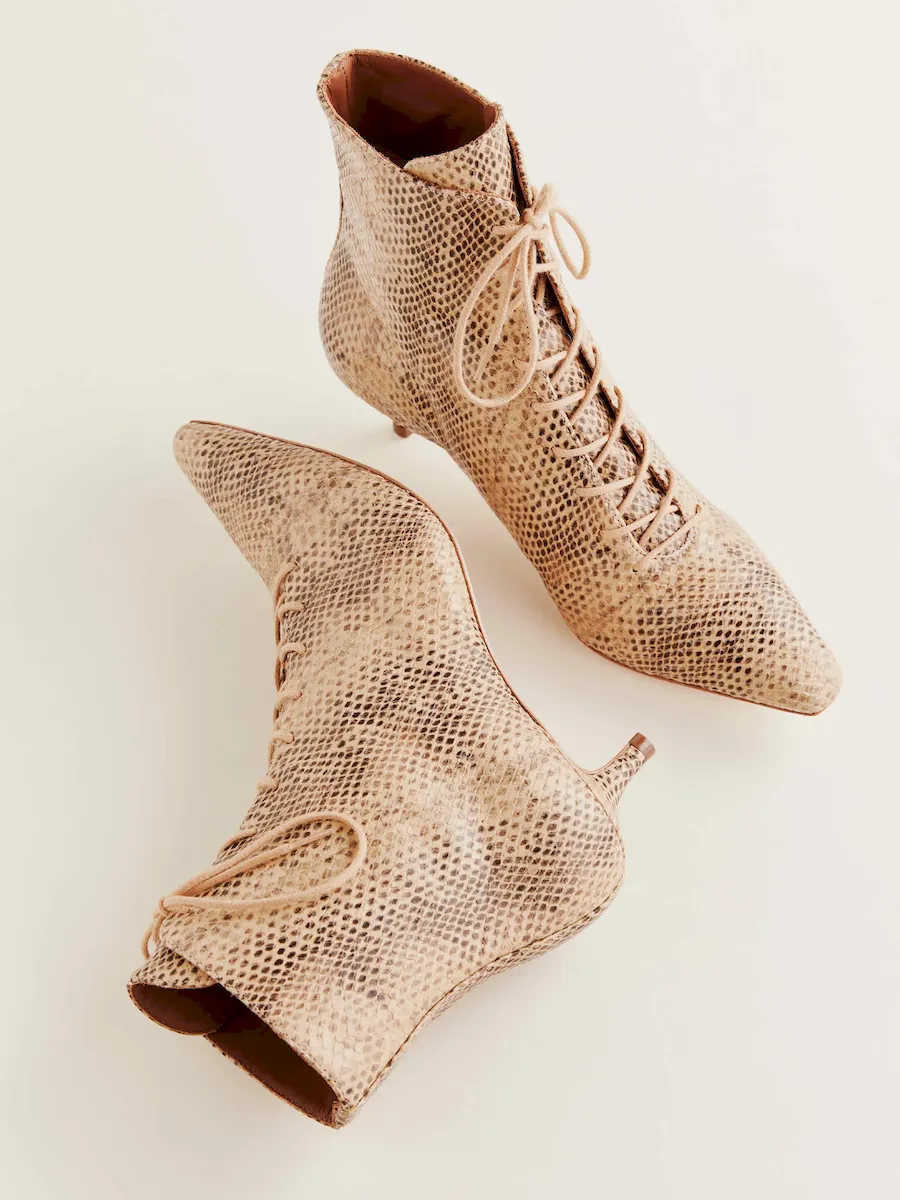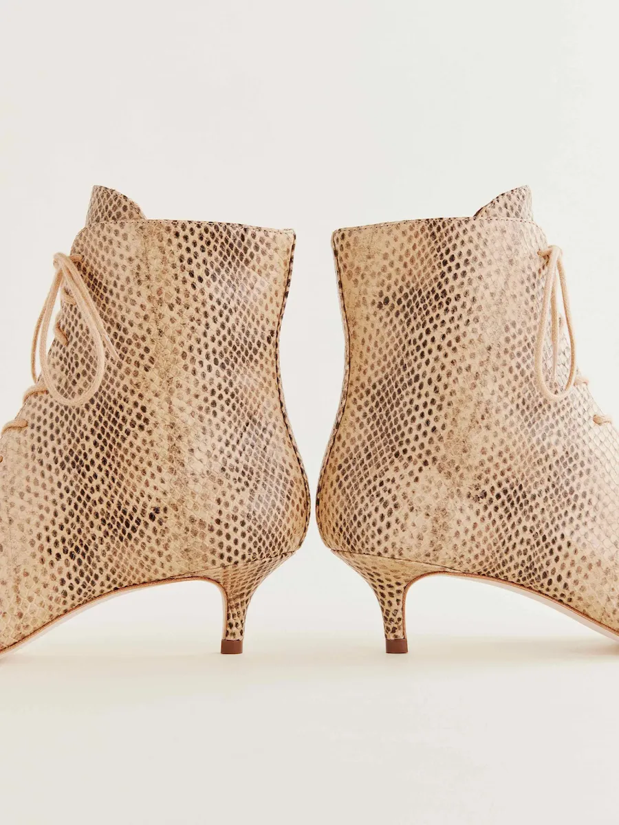 Upper is made from an embossed and printed snake pattern on cow leather. Spot clean. More onfabric & care.