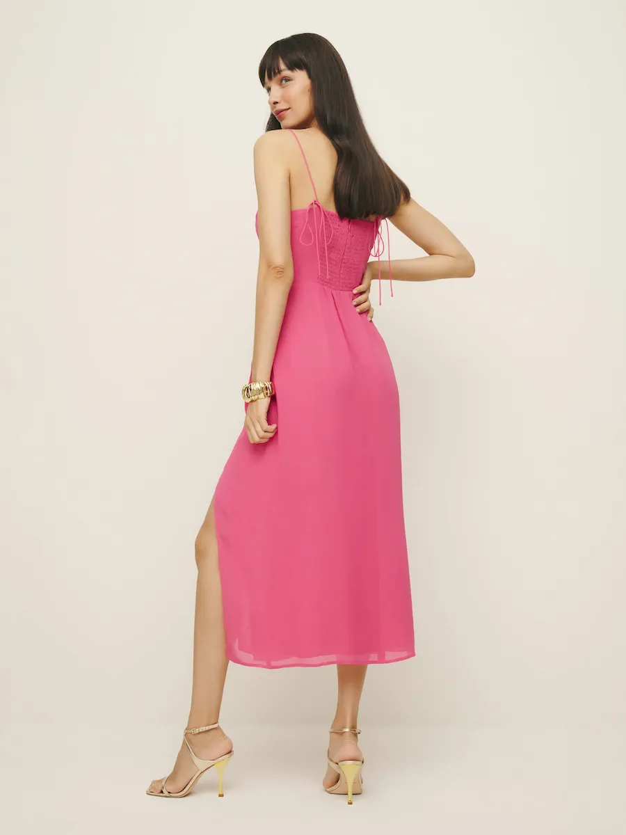 back smocking, tie straps, sweetheart neckline, side slit.
