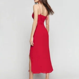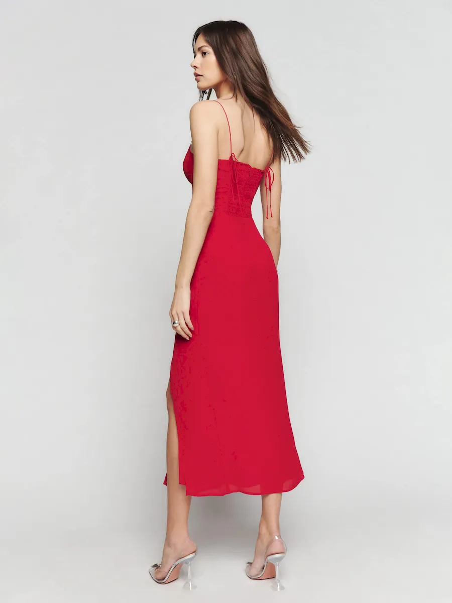 back smocking, tie straps, sweetheart neckline, side slit.