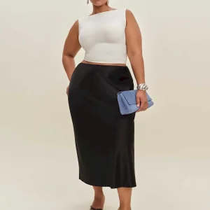 The model is wearing a size 14 and has a 33″ waist, 50″ hips.