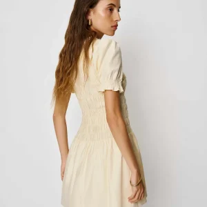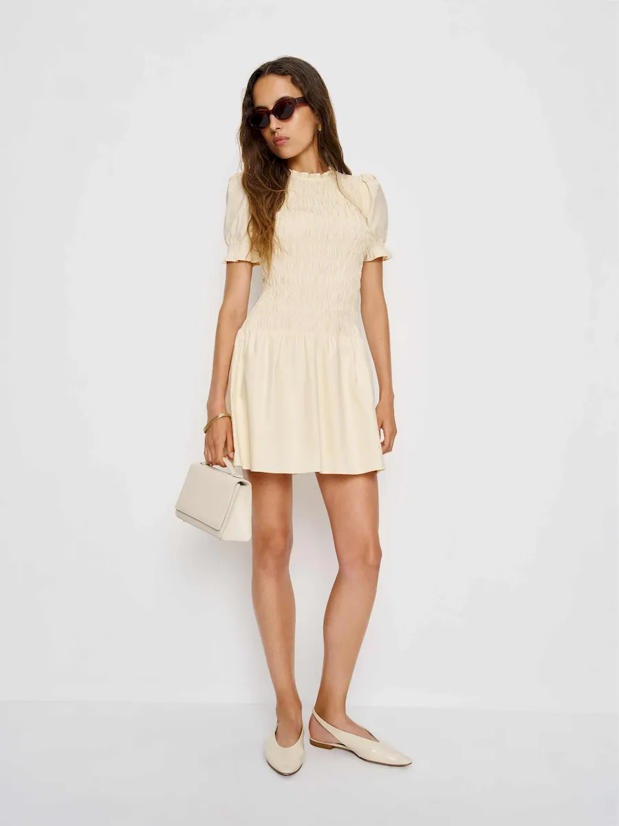 full bodice smocking, crew neckline.