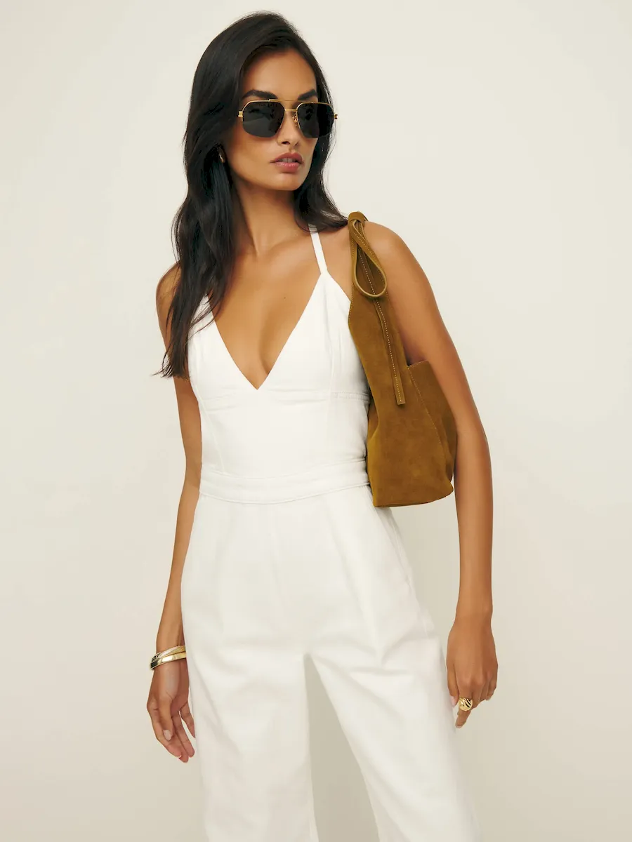 The model is wearing a size 0 and has a 25″ waist, 35″ hips.