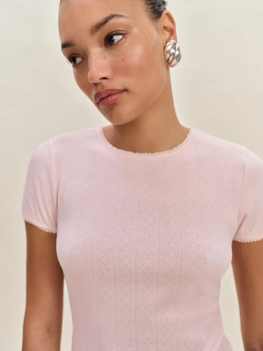 This is a medium weight, knit pointelle fabric made from 100% Organically grown cotton. Wash cold + line dry. More onfabric & care.