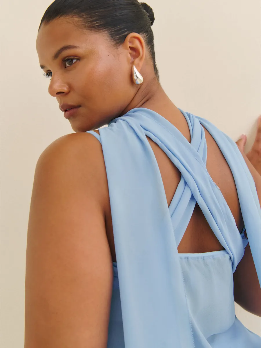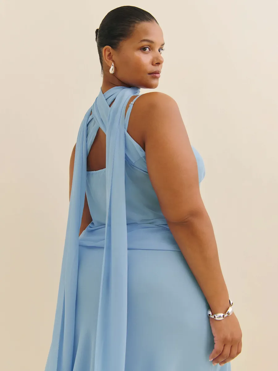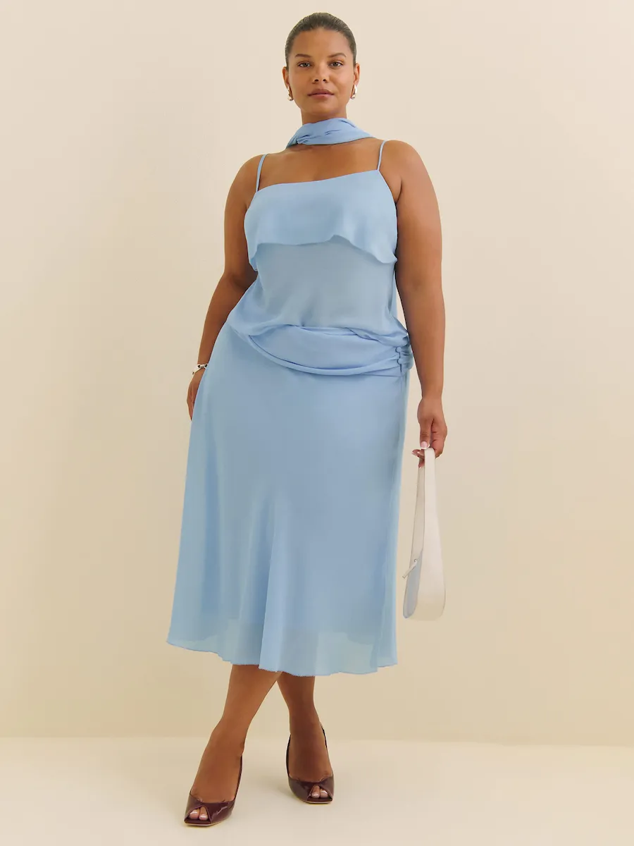 The model is wearing a size 14 and is 5’8″, 33″ waist, 50″ hips, 42″ bust.