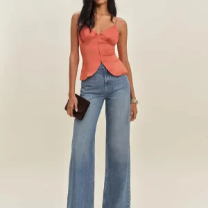 The model is wearing a size 0 and is 5’11”, 24″ waist, 35″ hips, 31″ bust.