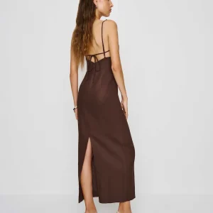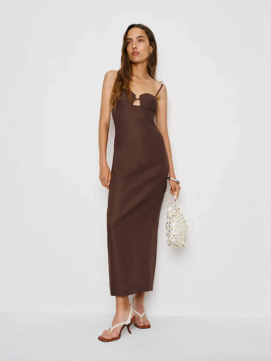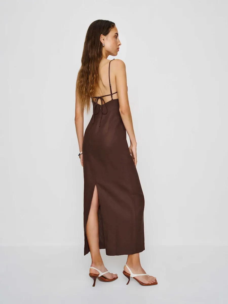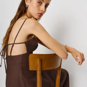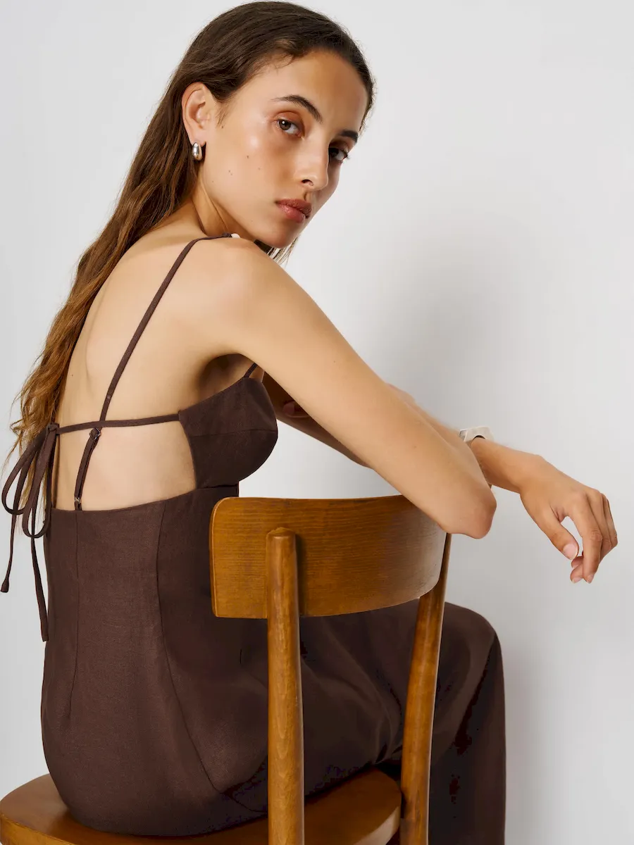 the malibu linen dress in cafe features beads on the strap.