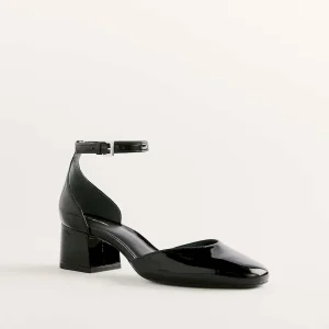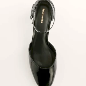 Black bovine leather with lustrous patent finish.
