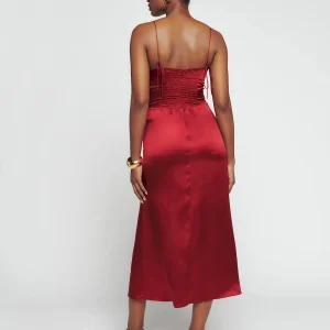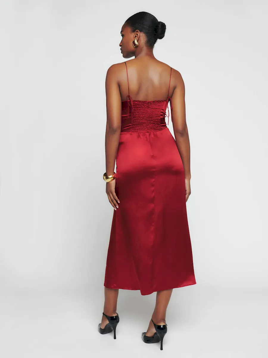 back smocking, tie straps, sweetheart neckline, side slit.