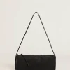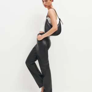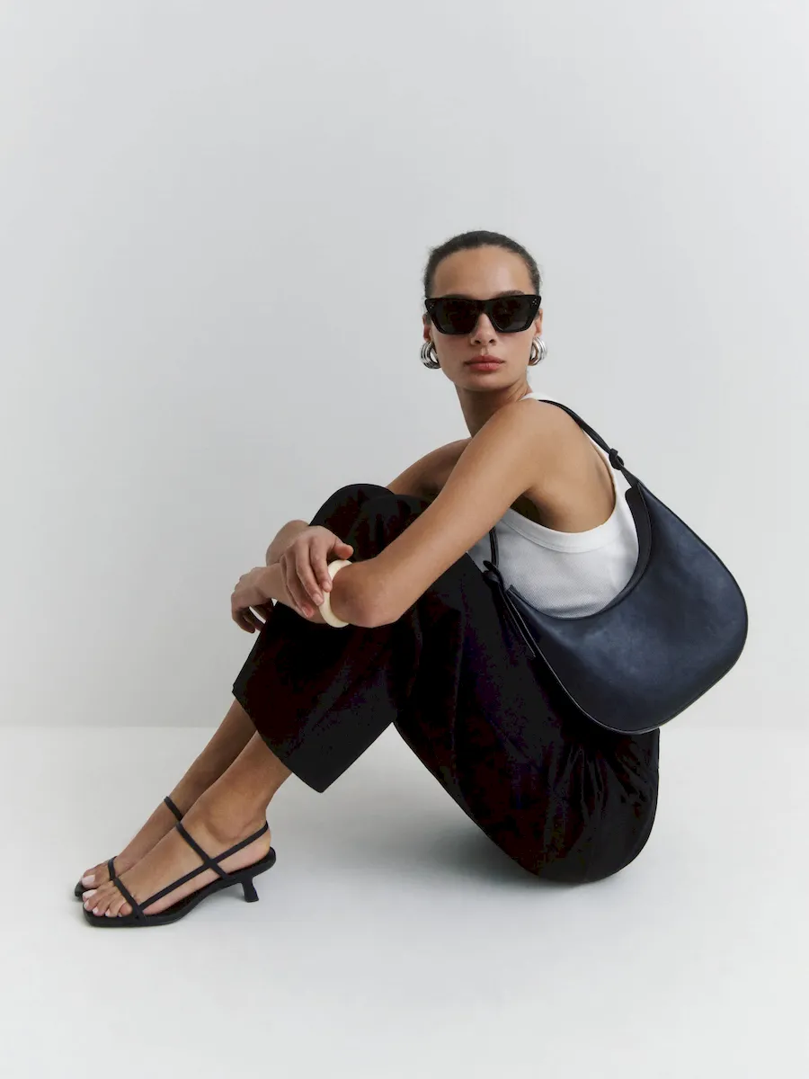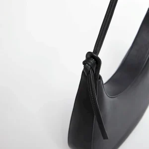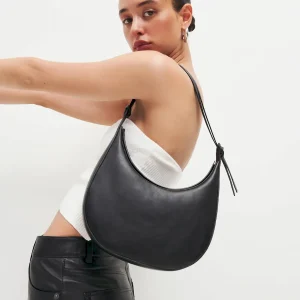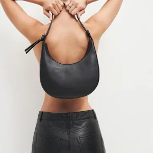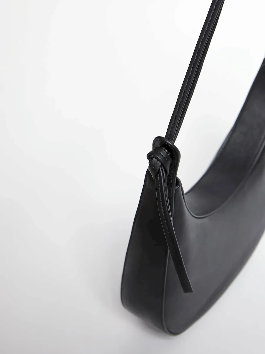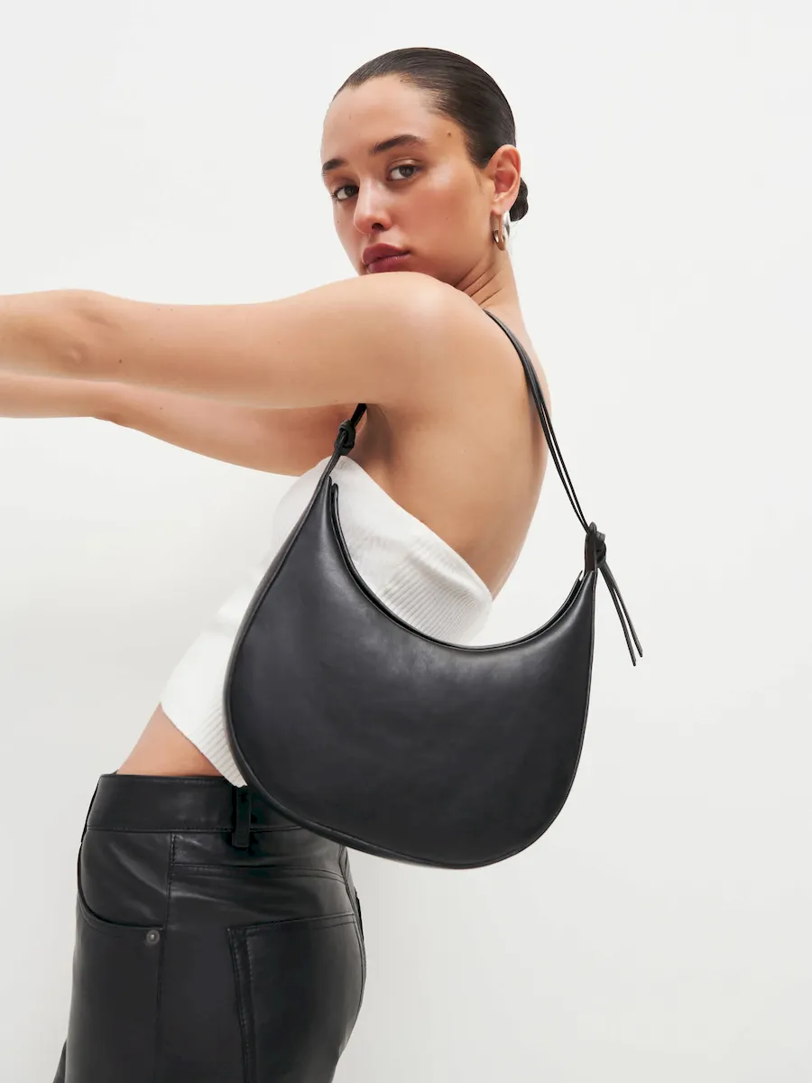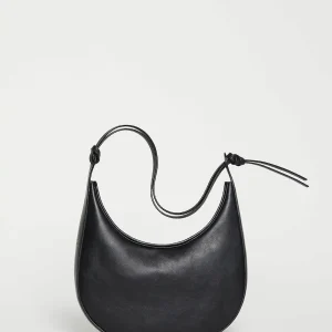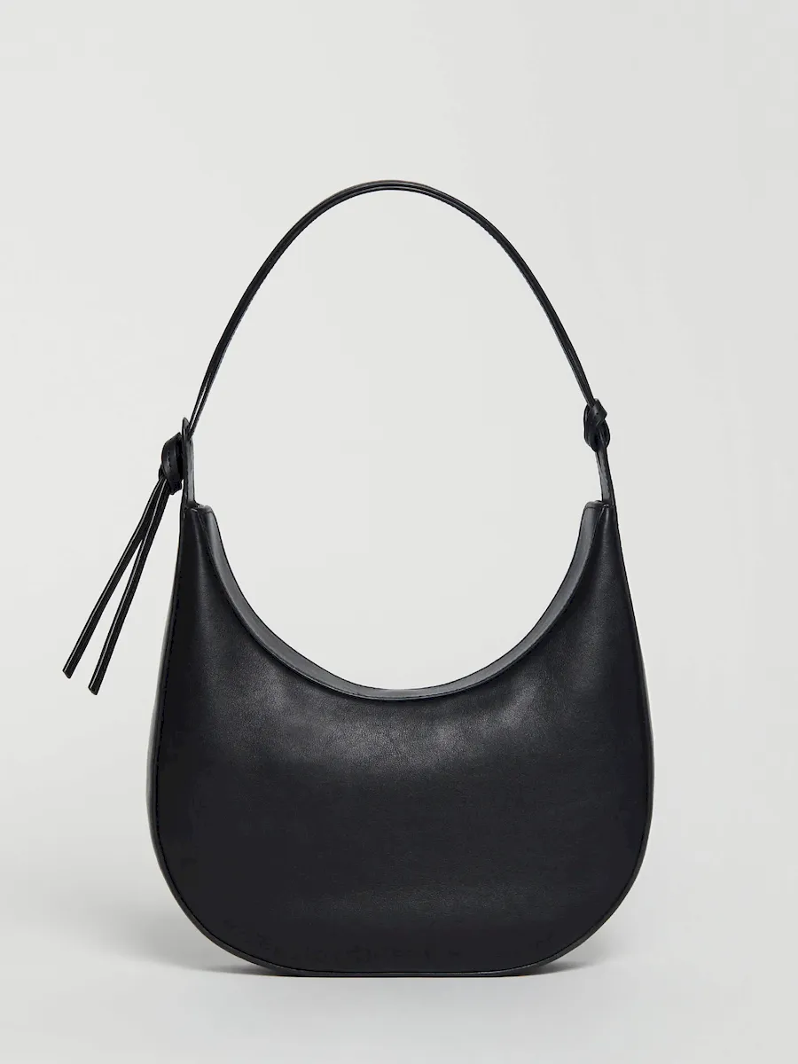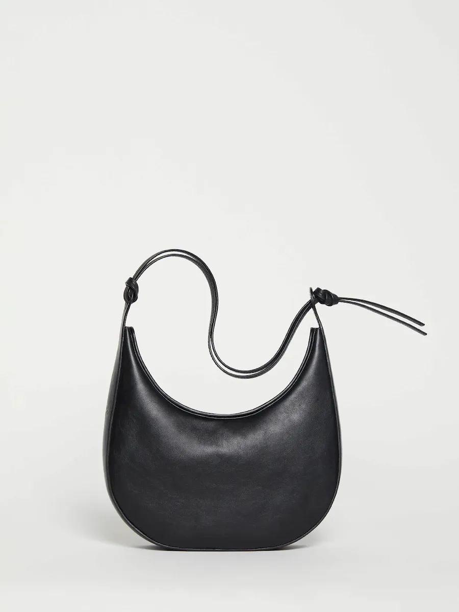 crescent shaped leather shoulder bag with a decorative tie detailand interior pockets.