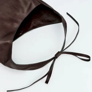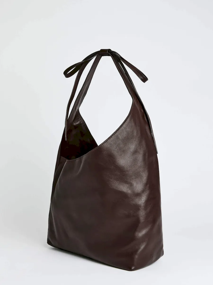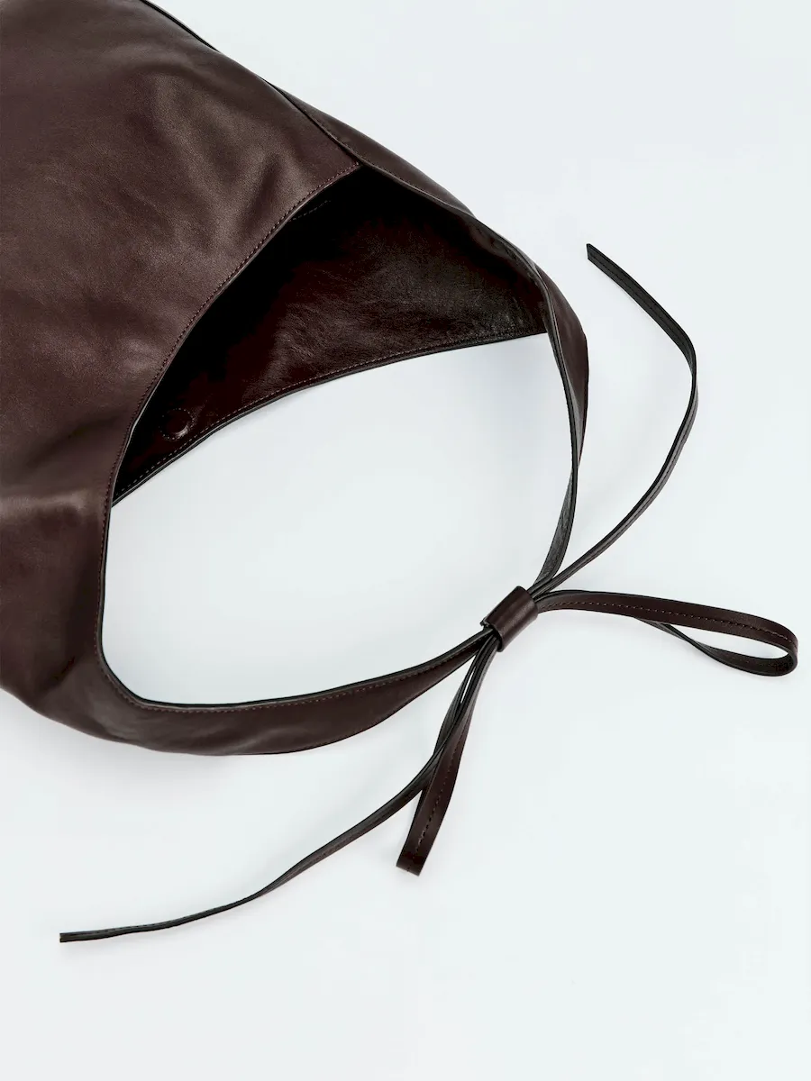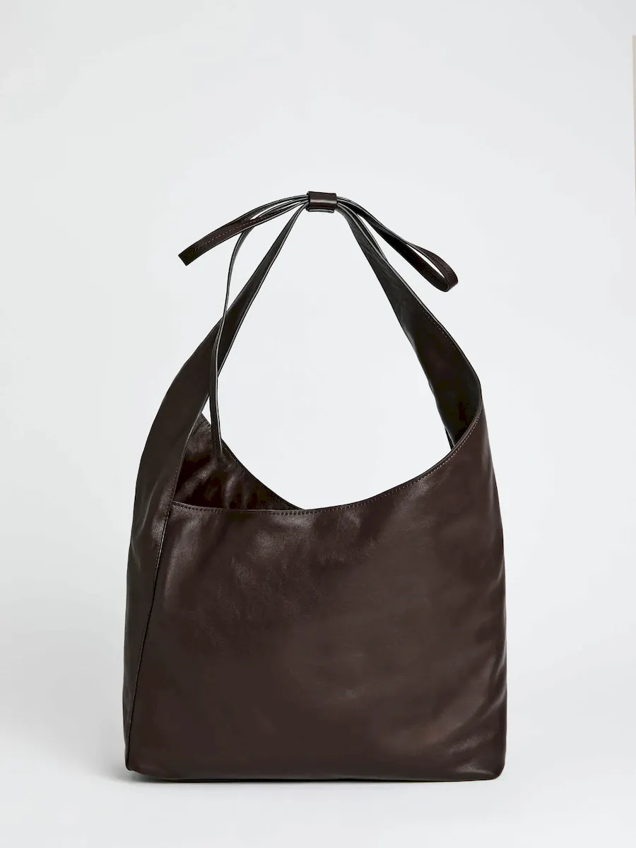 a slouchy tote with a magnetic closure,features a decorative tie detail,and inside zip pocket with a card holder.