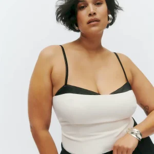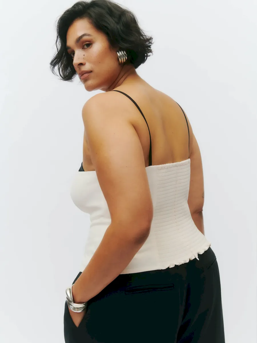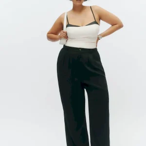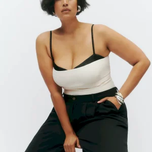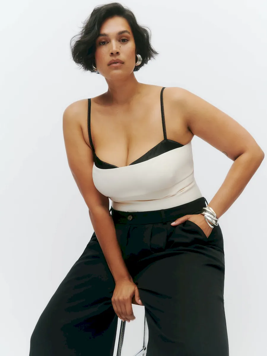 The model is wearing a size 14 and is 5’9.5″, 29″ waist, 43.5″ hips, 39.5″ bust.