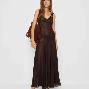 The model is wearing a size 0 and is 5’9″, 24″ waist, 34″ hips, 30″ bust.