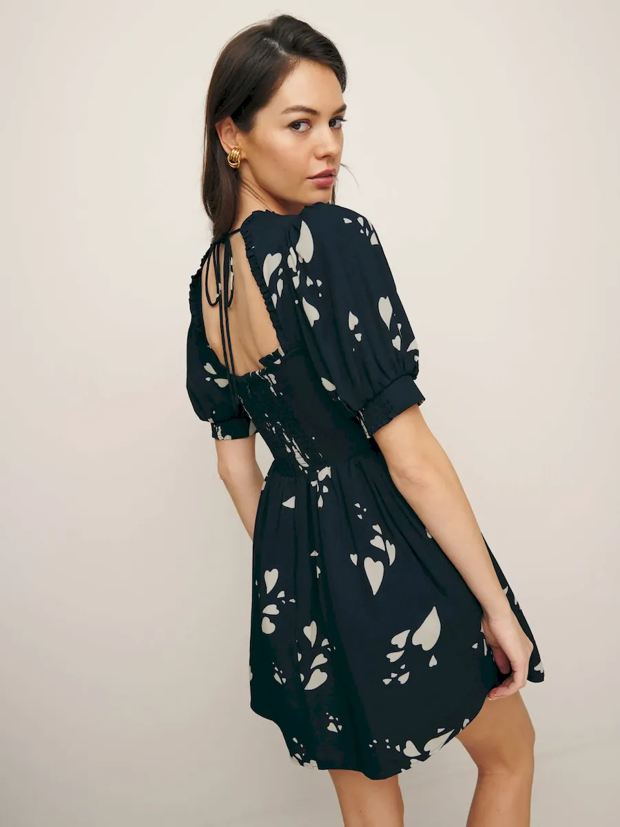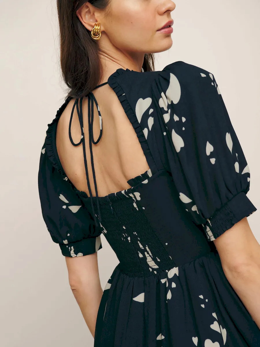 back smocking, sweetheart neckline.