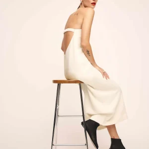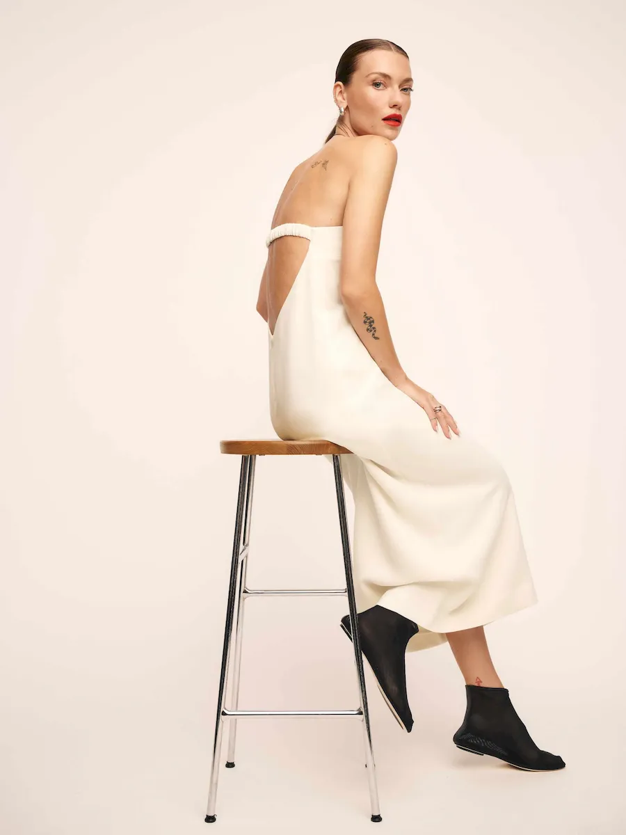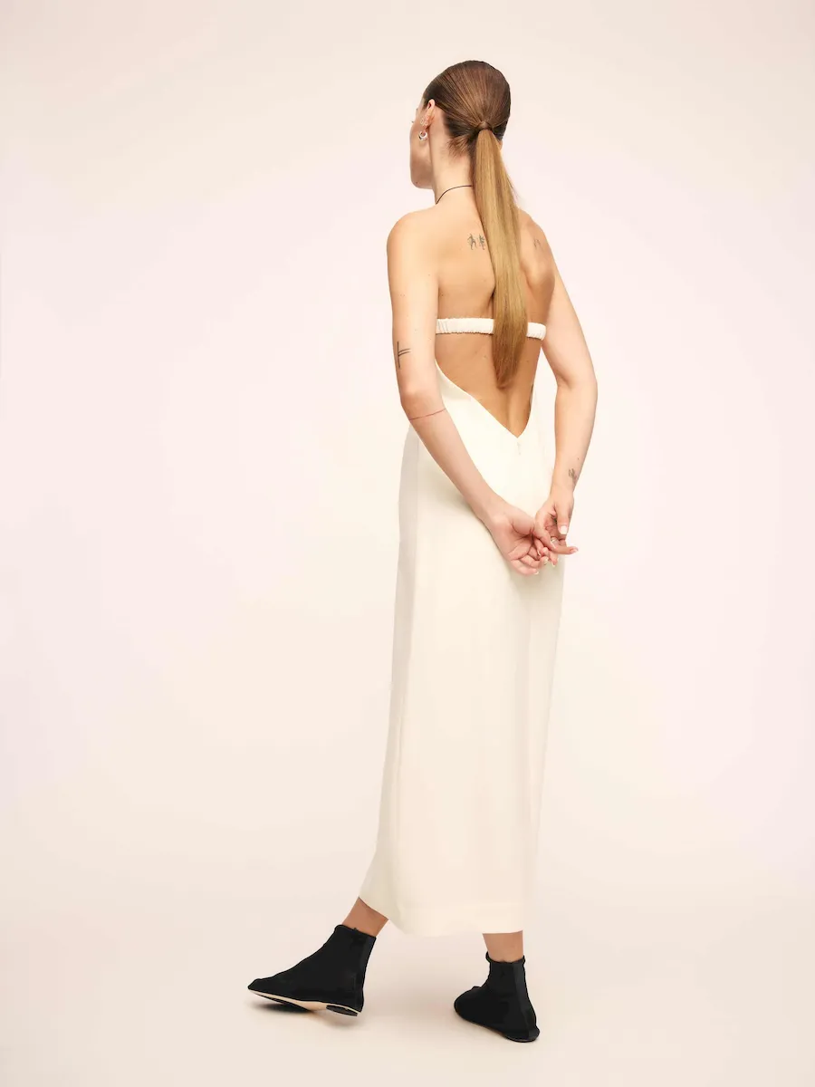 The model is wearing a size 0 and is 5’10”, 25″ waist, 34.5″ hips, 31″ bust.