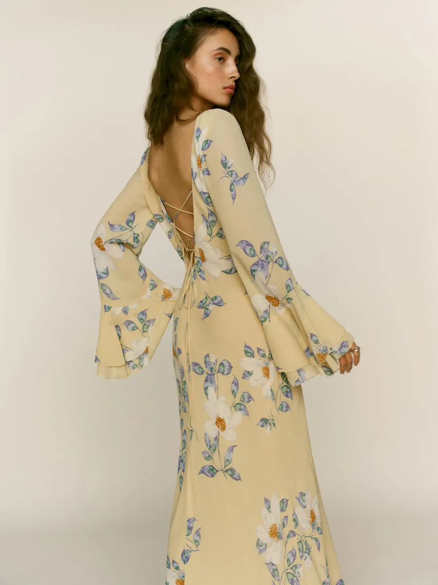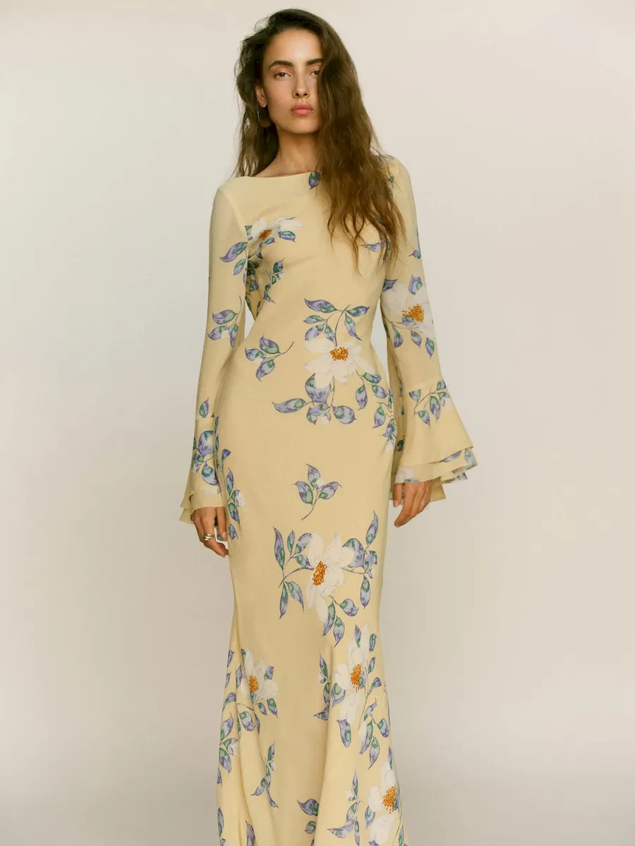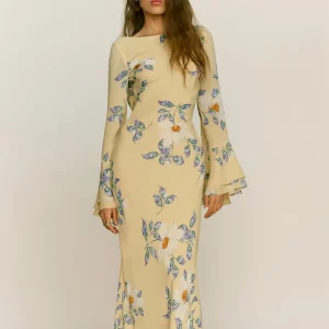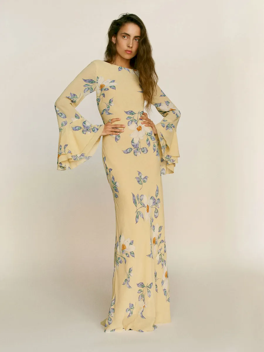 The model is wearing a size 0 and is 5’9″, 24″ waist, 34″ hips, 30″ bust.