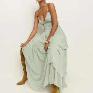 The model is wearing a size 4 and is 5’11”, 26″ waist, 38″ hips, 35″ bust.