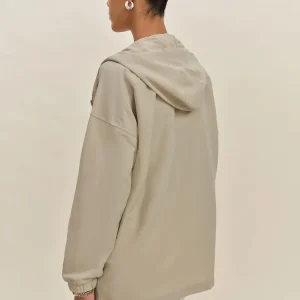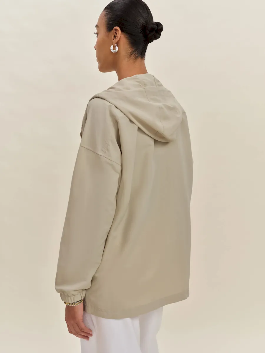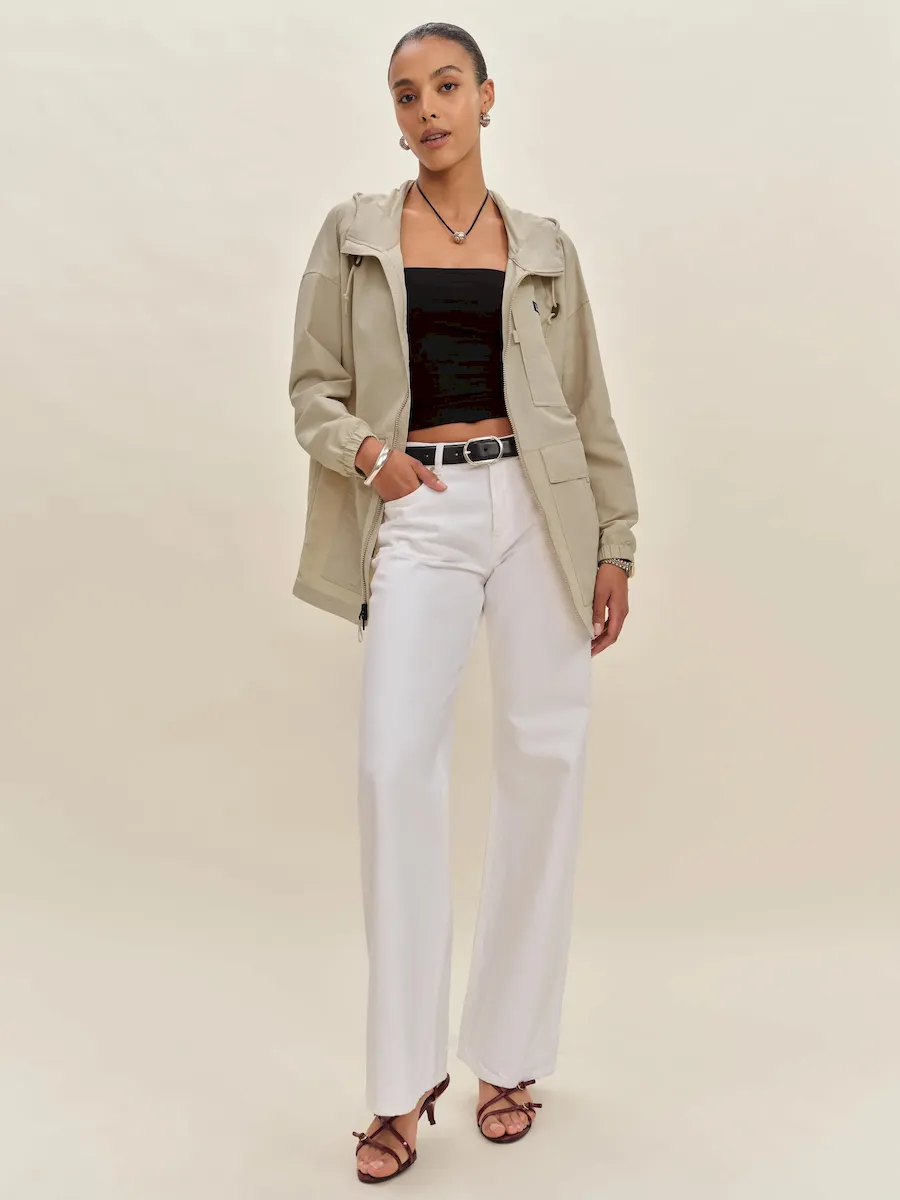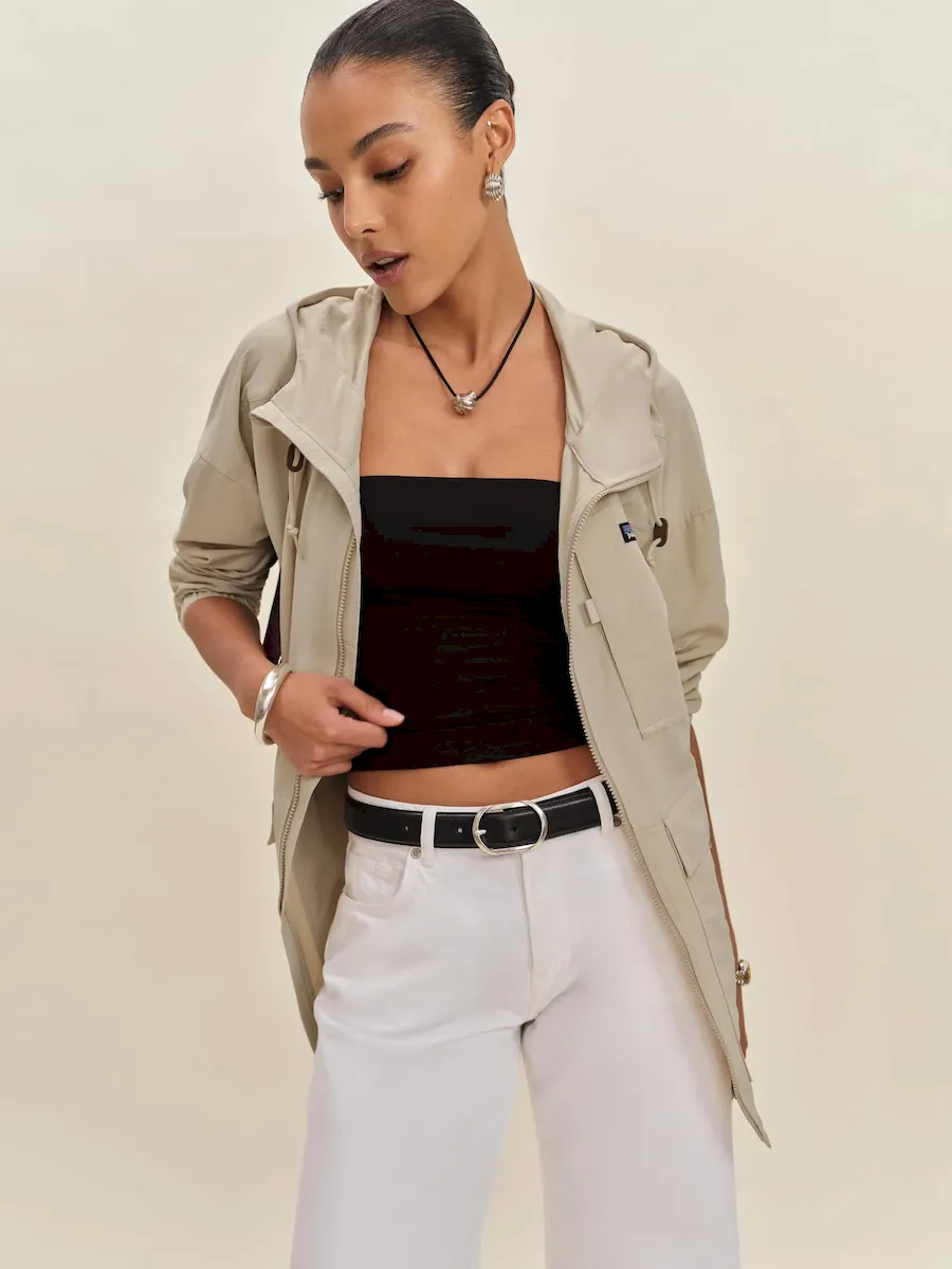 front zipper,dropped shoulders,and interior pockets.