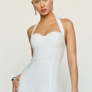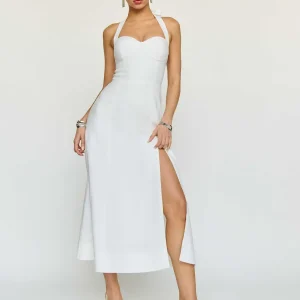 back smocking, tie straps, halter neckline, front slit.