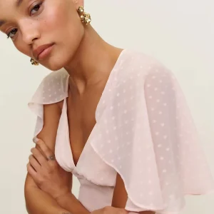 The model is wearing a size 0 and is 5’10”, 23″ waist, 34″ hips, 32″ bust.