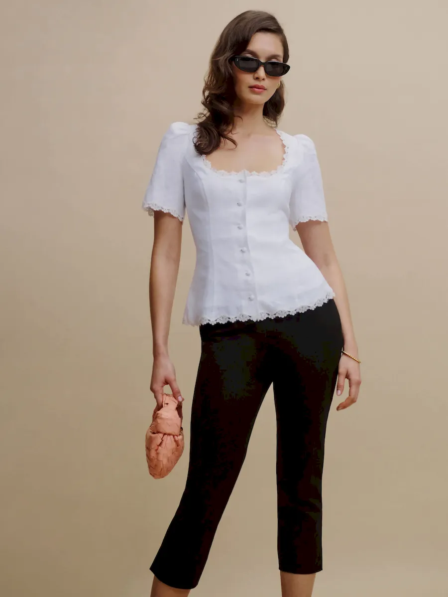 product size: 4, inseam: 22″, front rise: 10″, leg opening: 14″.