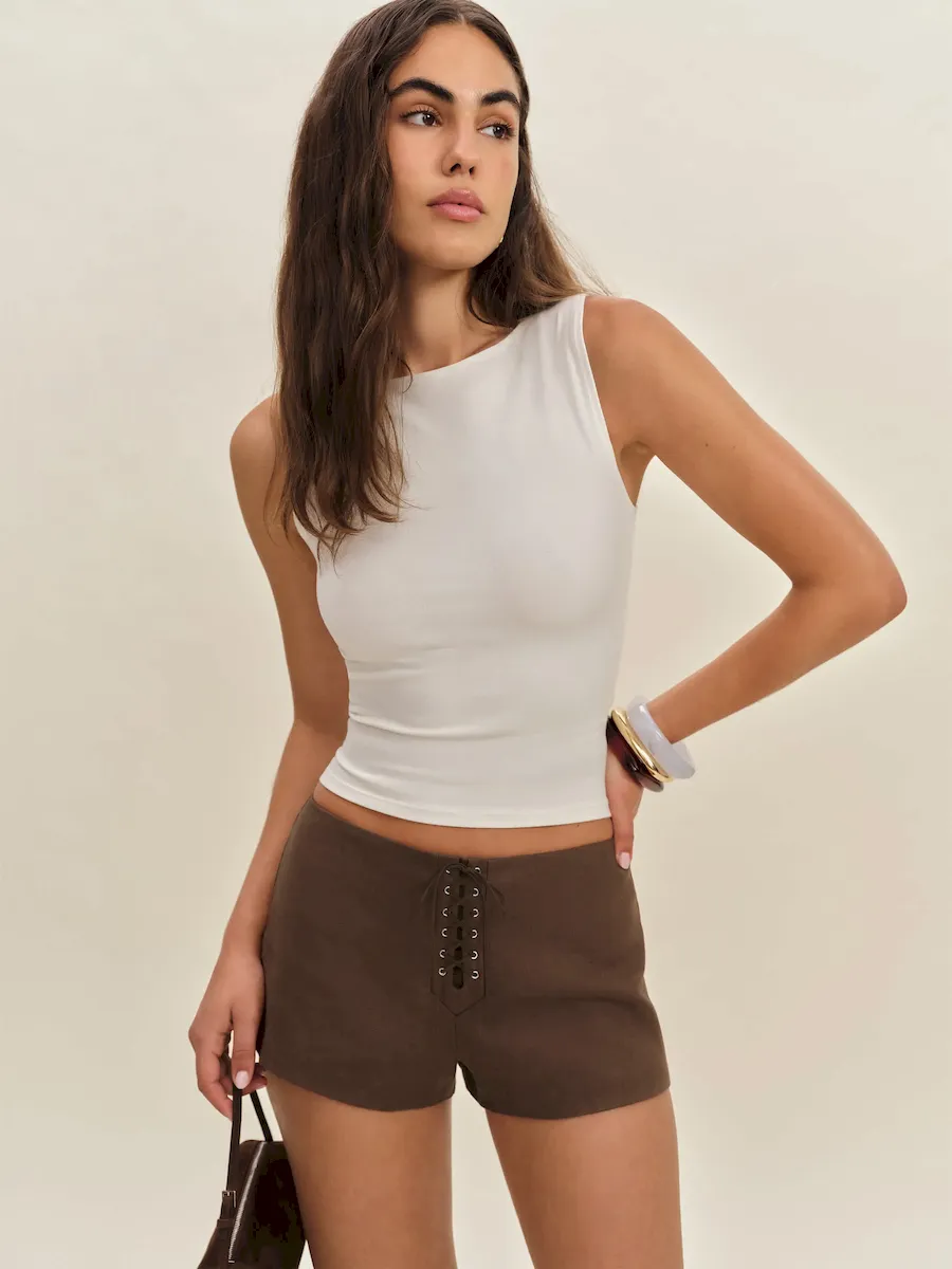 The model is wearing a size 0 and has a 24″ waist, 34.5″ hips.
