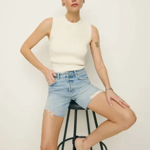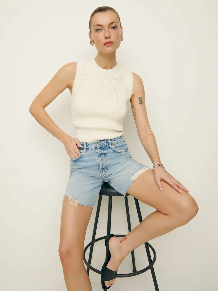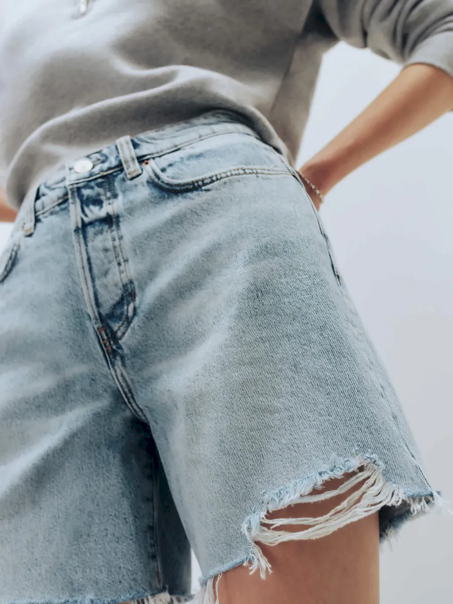 The model is wearing a size 25 and has a 25″ waist, 34.5″ hips.