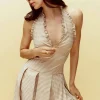 The model is wearing a size 0 and is 5’10”, 23″ waist, 34″ hips, 32″ bust.