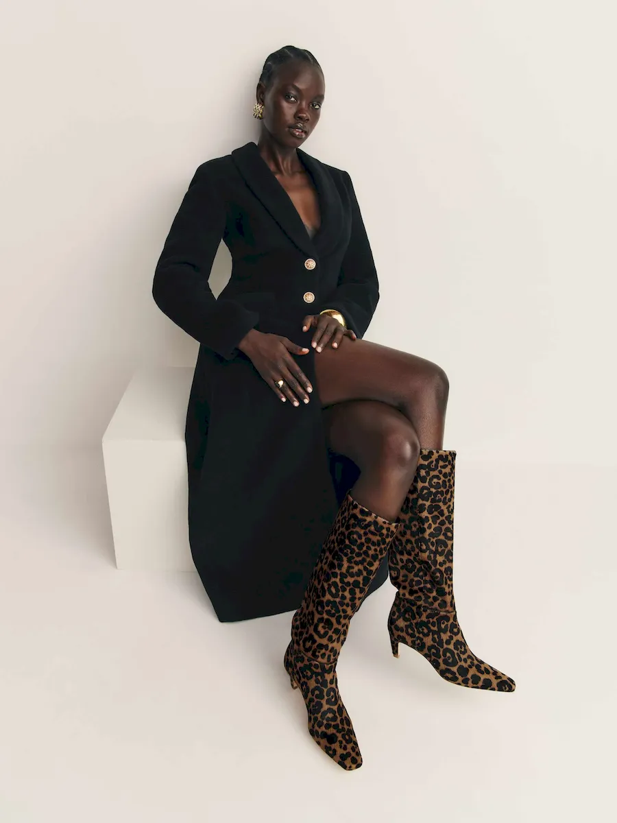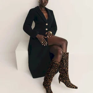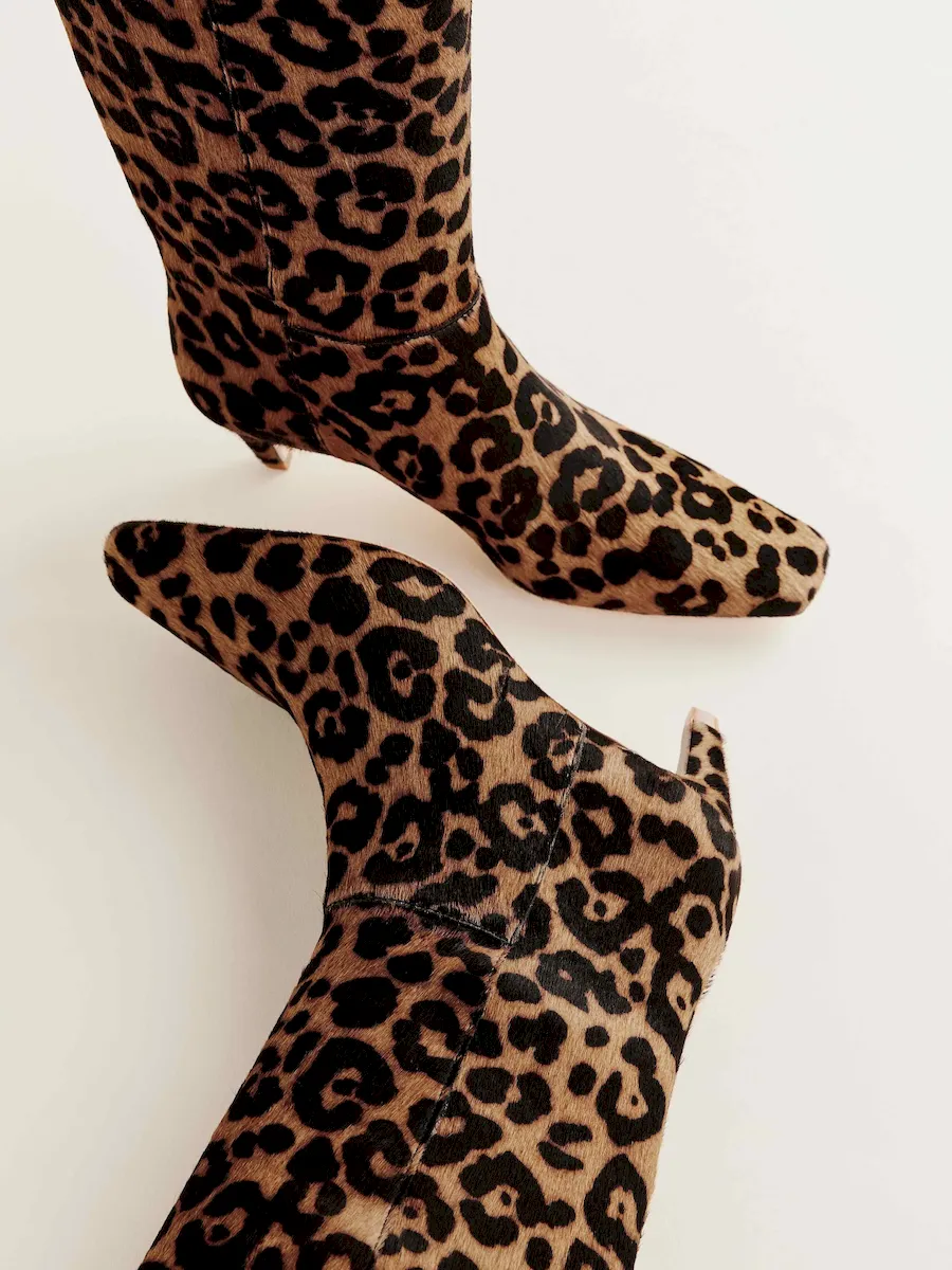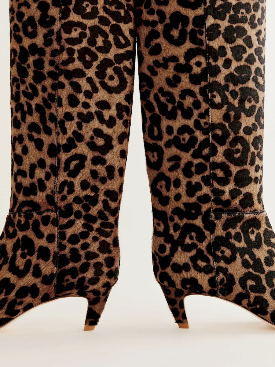 Silky hair calf with leopard print. Spot clean. More onfabric & care.