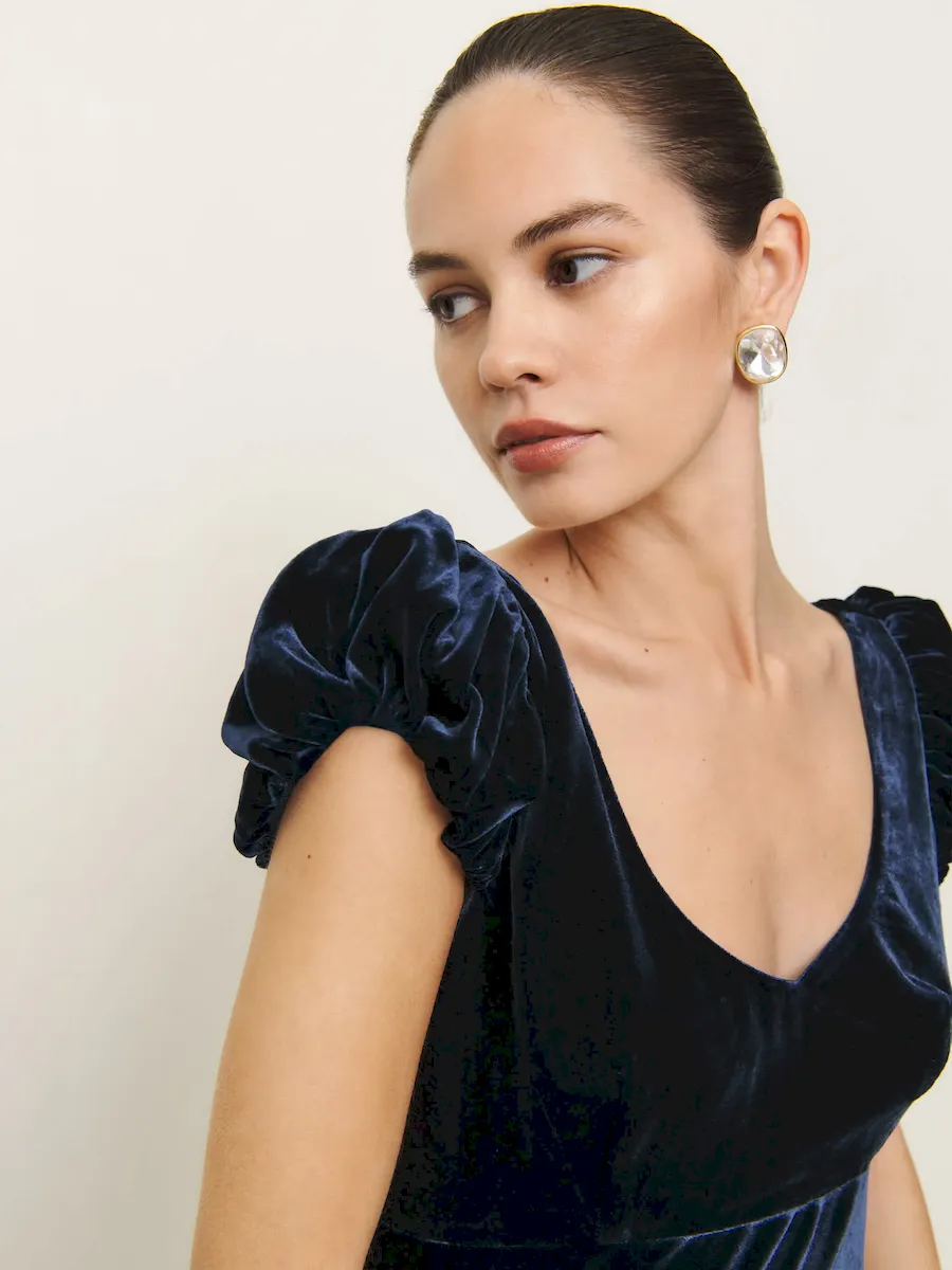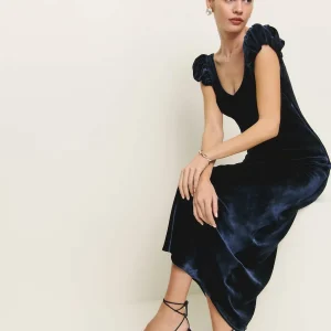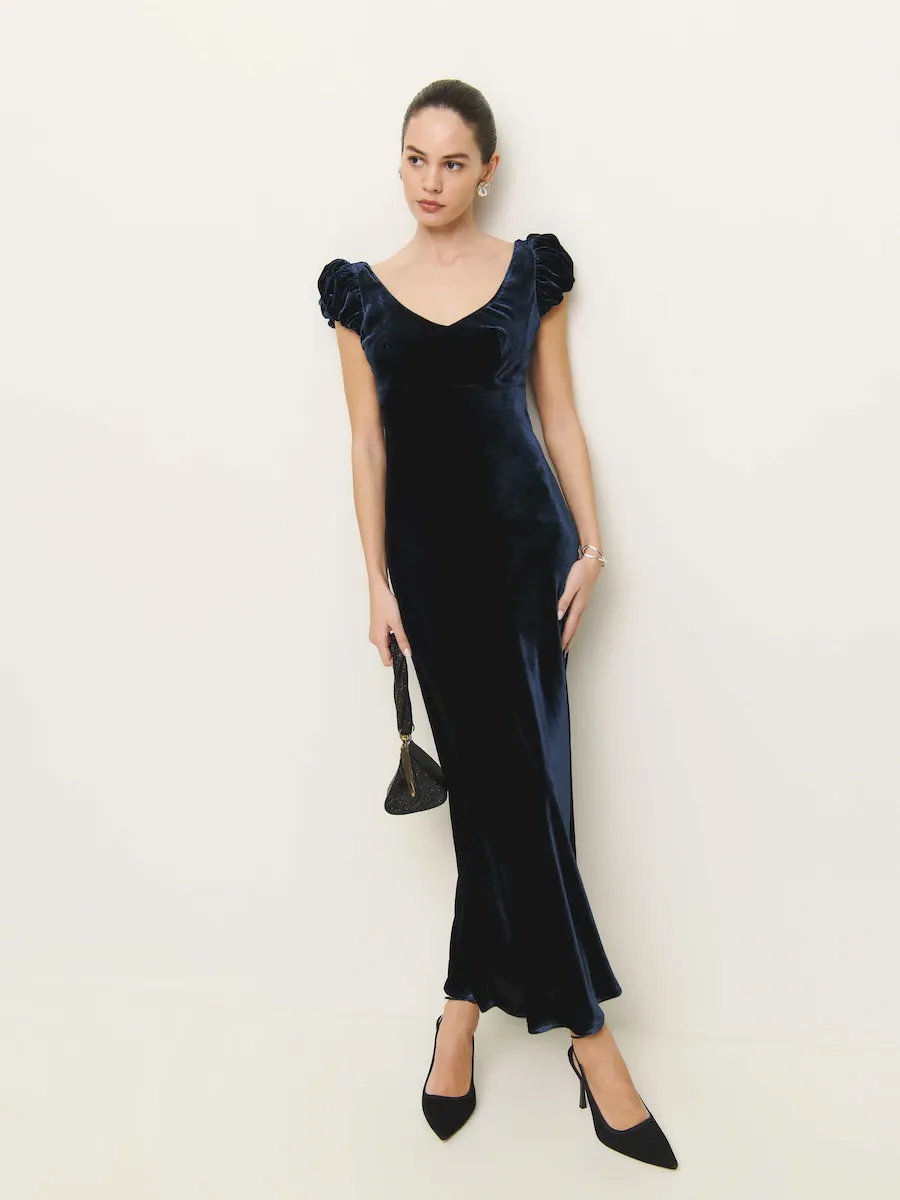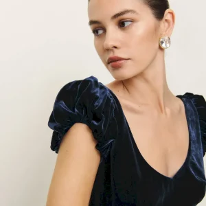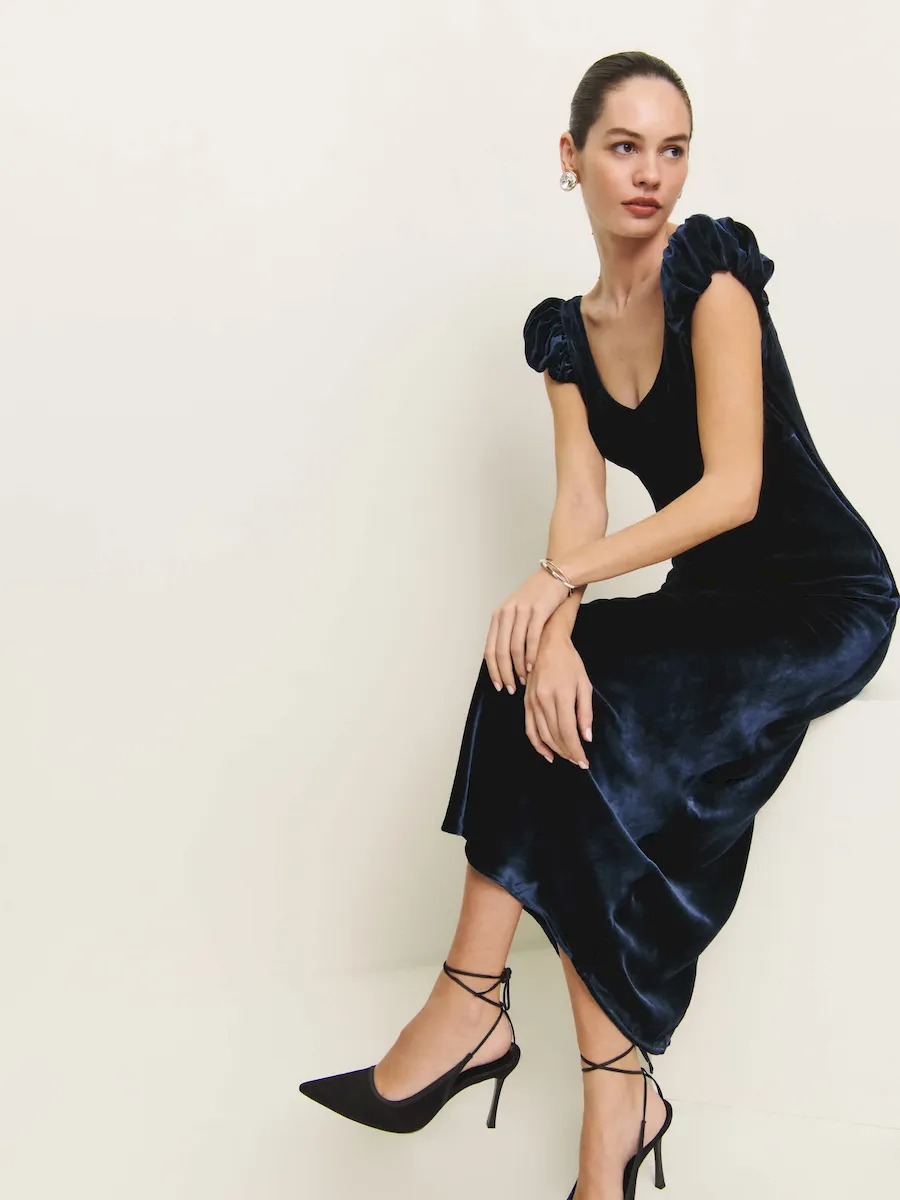 This is a soft, non-stretch velvet with a medium pile – 82% rayon, 18% silk. Dry clean only. More onfabric & care.