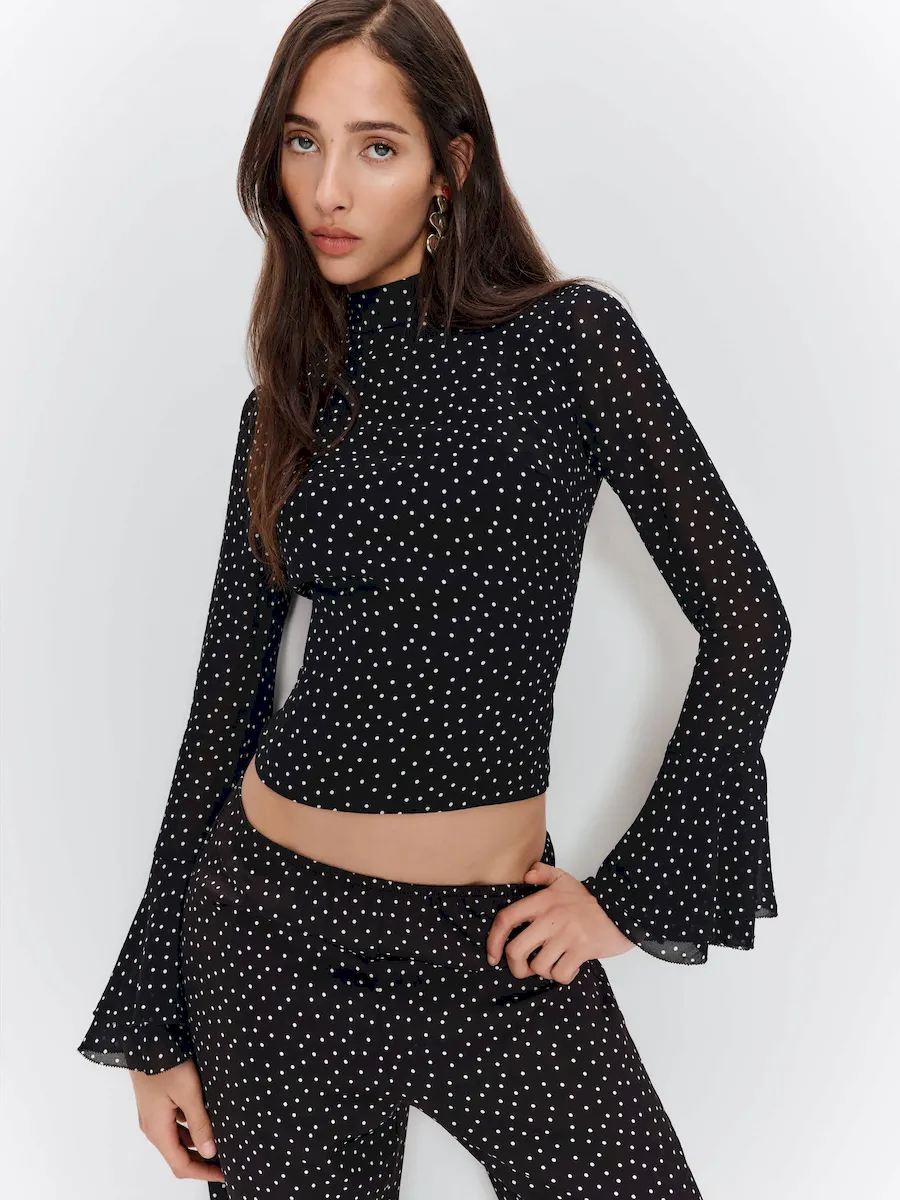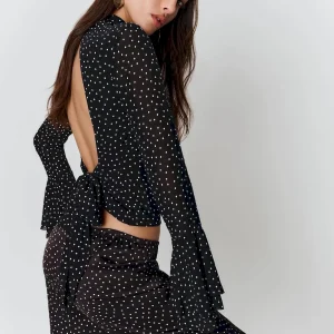 The model is wearing a size 2 and is 5’10”, 23″ waist, 34″ hips, 31″ bust.