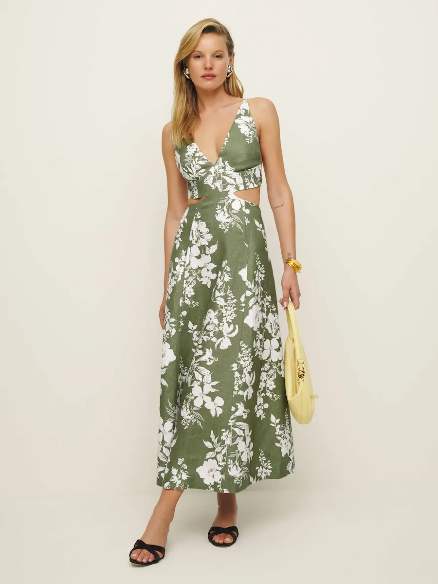 The model is wearing a size 0 and is 5’10”, 24″ waist, 33.5″ hips, 30″ bust.