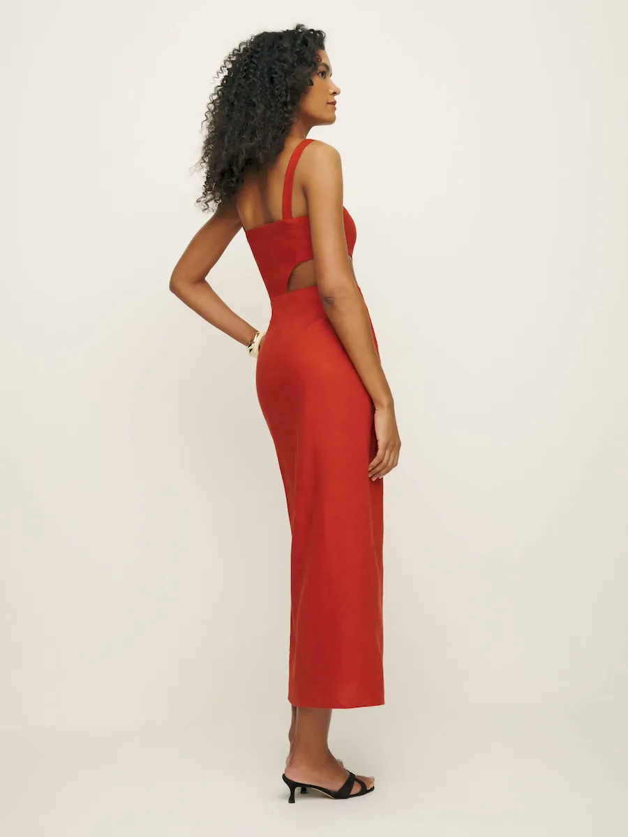 The model is wearing a size 2 and is 5’9″, 24″ waist, 34″ hips, 32″ bust.