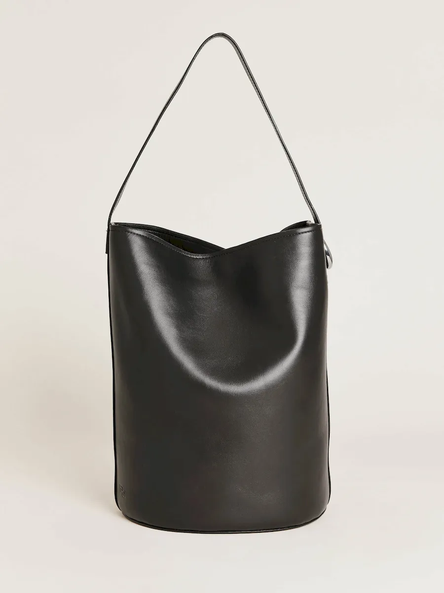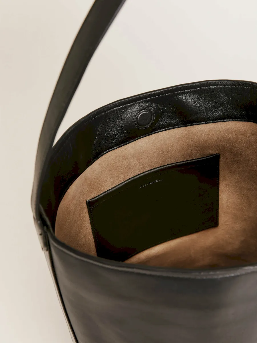 a slouchy bucket bag with a magnetic closureand inside card pocket.