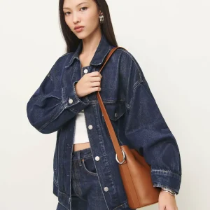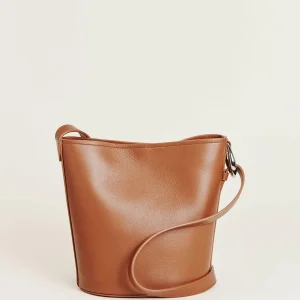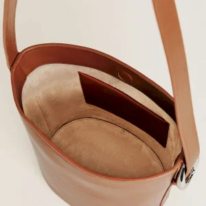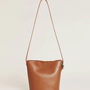 a structured bucket bag,inside card pocket,magnetic closure,and silver hardware details.