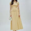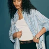 The model is wearing a size 0 and is 5’10”, 25″ waist, 35″ hips, 32″ bust.