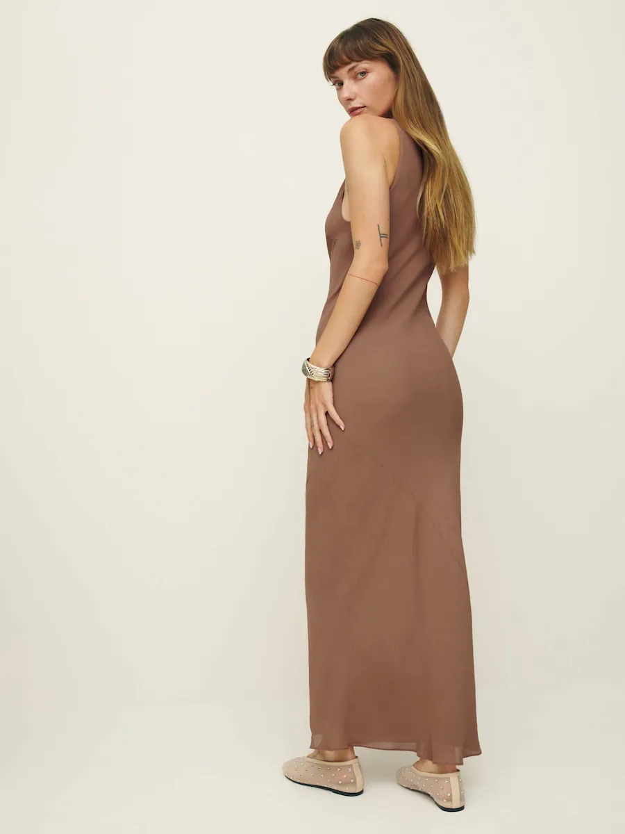 The model is wearing a size 0 and is 5’10”, 25″ waist, 34.5″ hips, 31″ bust.