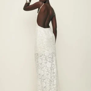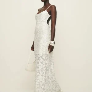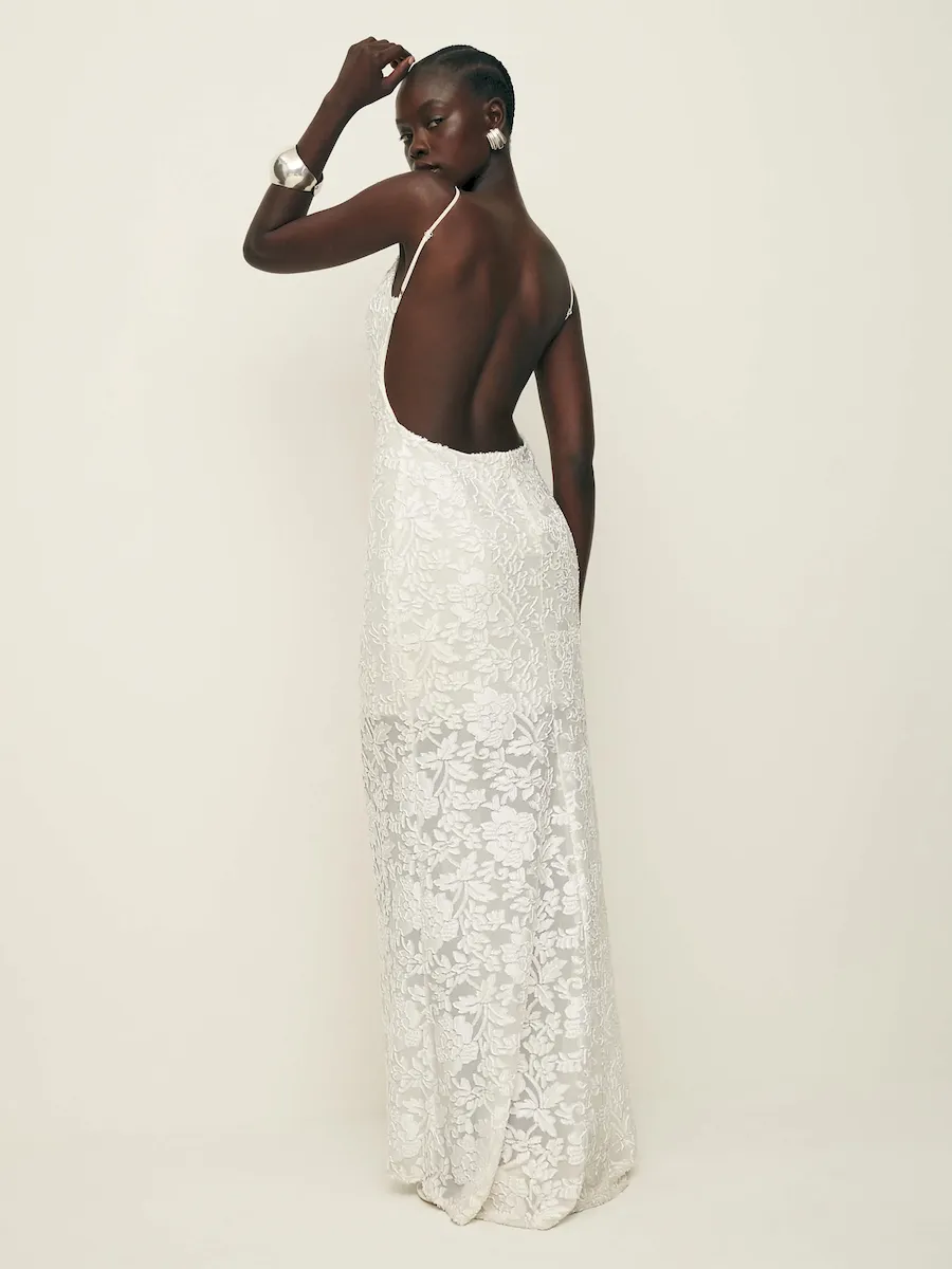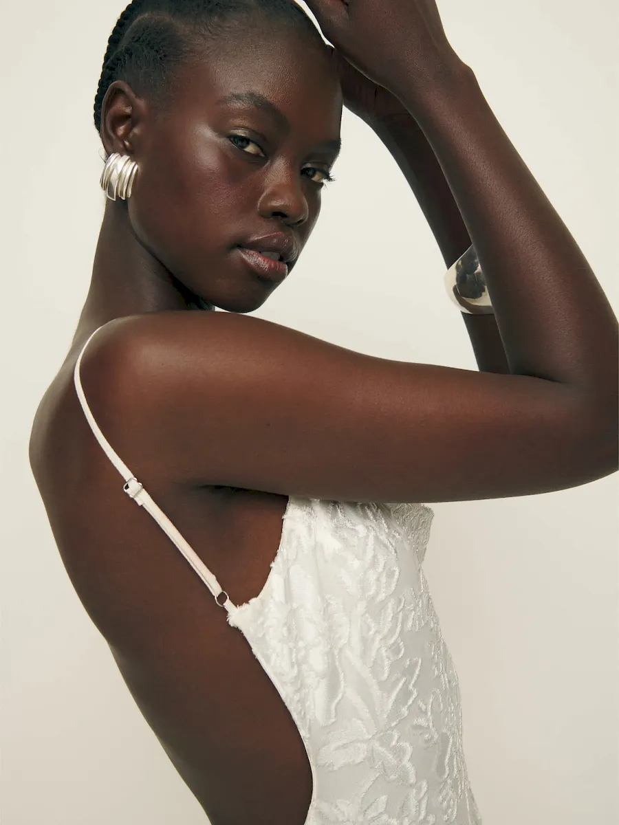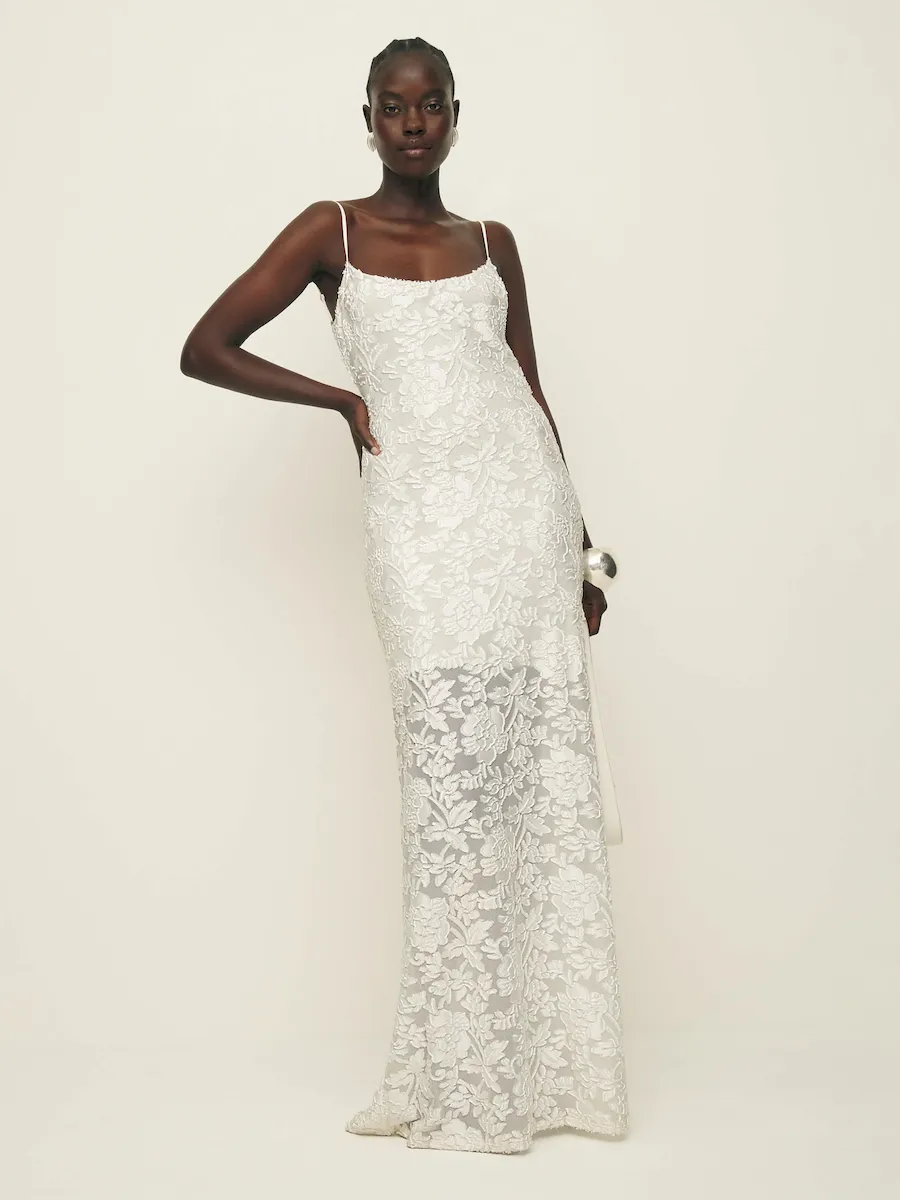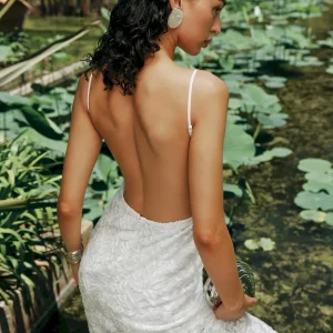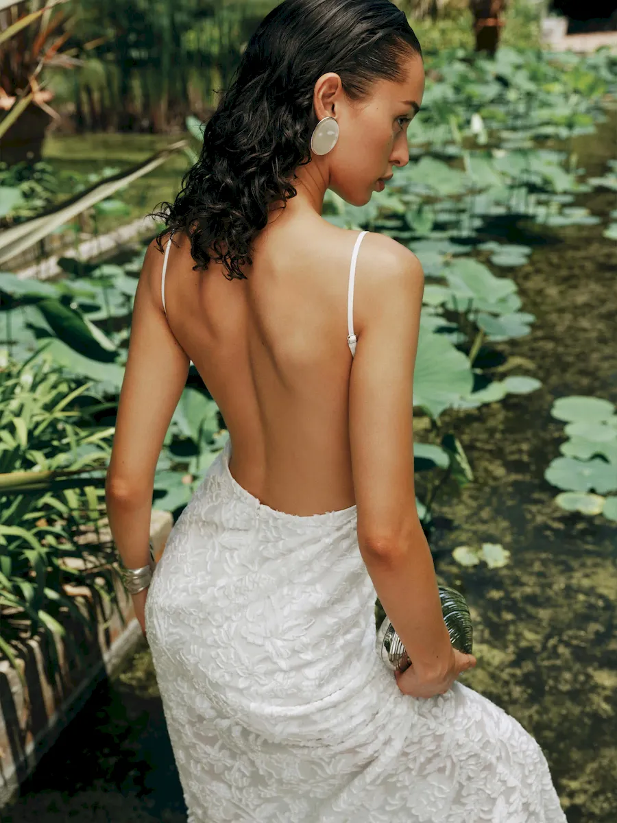 The model is wearing a size 0 and is 5’8″, 23″ waist, 35.5″ hips, 30″ bust.
