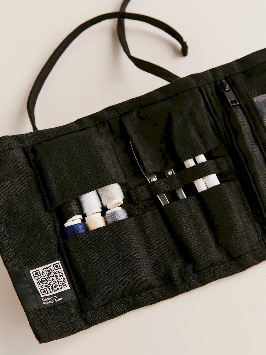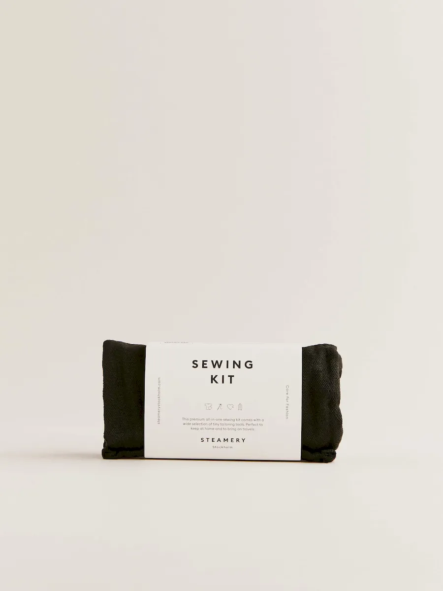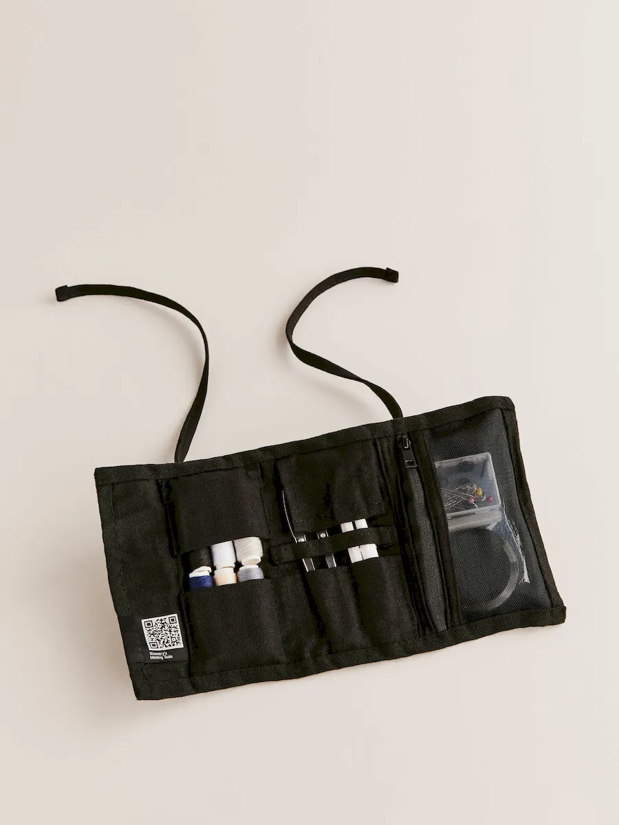 Buttons x 12, Fabric pen, Measuring tape, Metal thimble, Needles x 7, Needle threader, Quick patches x 5, Safety pins x 4, Scissors, Seam ripper, Sewing pins x 10, Threads x 6.
