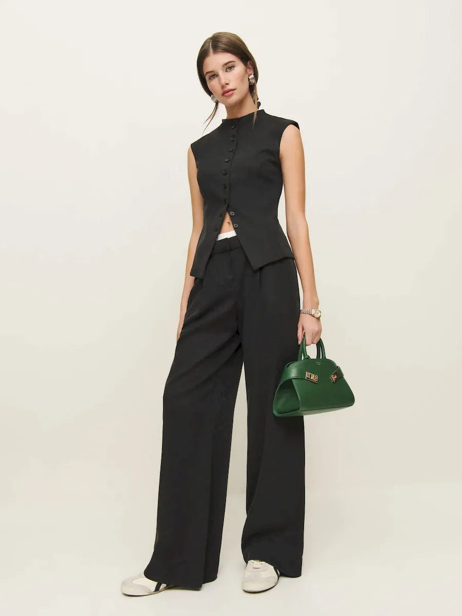 The model is wearing a size 0 and has a 23″ waist, 34″ hips.