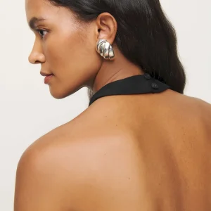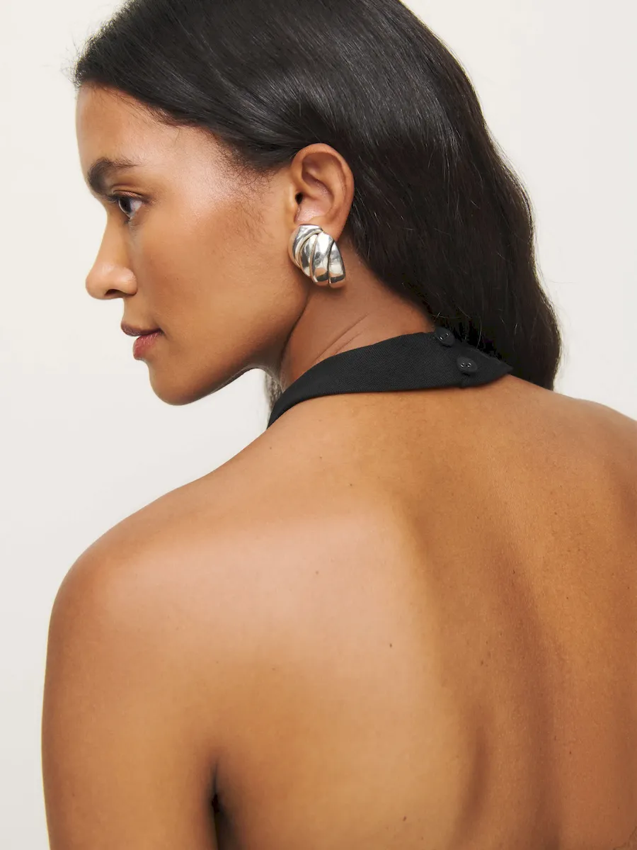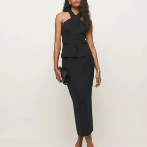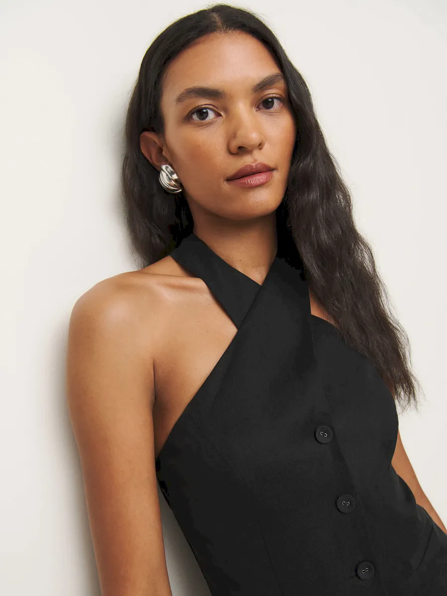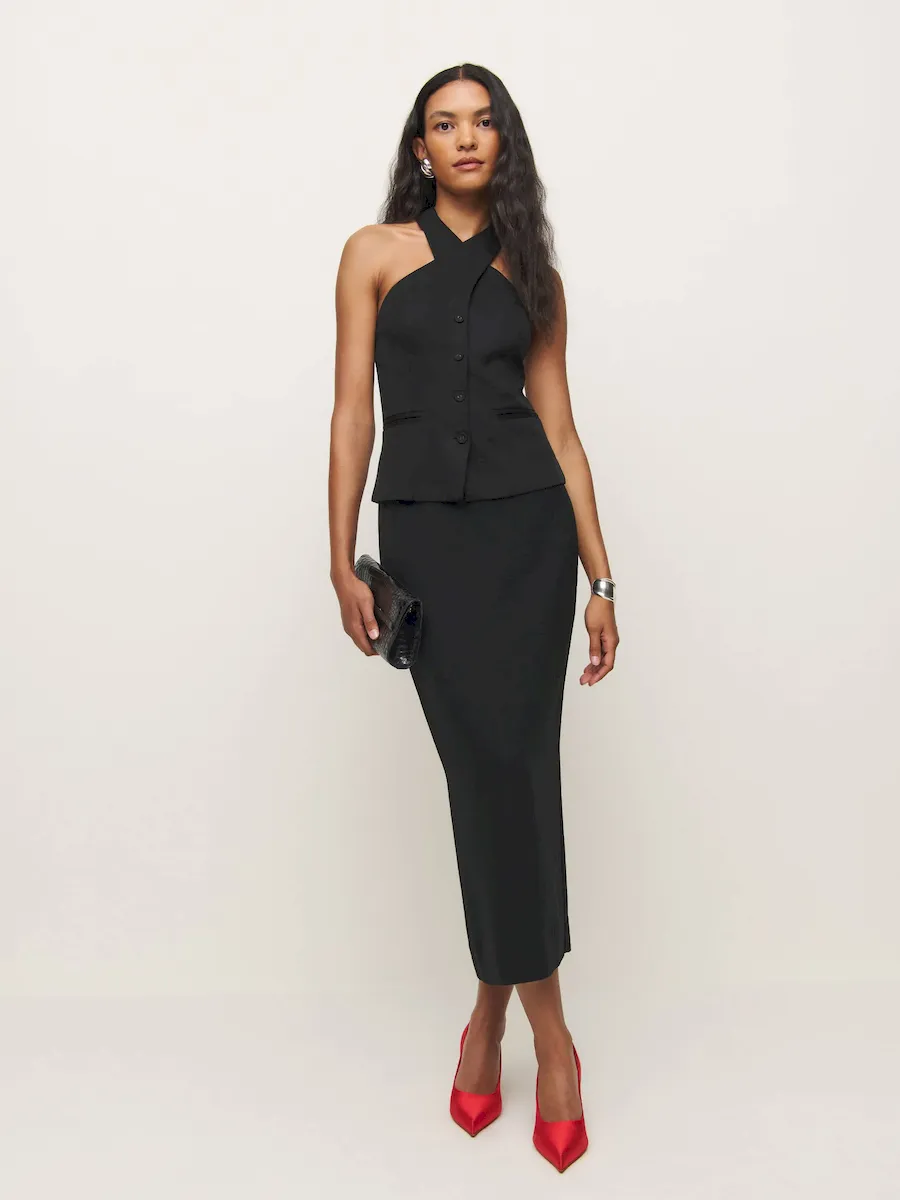 The model is wearing a size 0 and is 5’11”, 24″ waist, 34″ hips, 32″ bust.