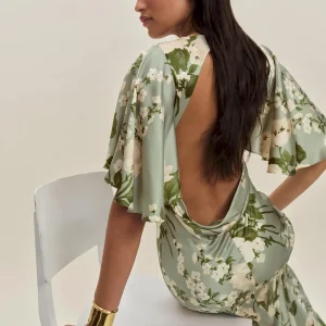 The model is wearing a size 0 and is 5’10”, 23″ waist, 34″ hips, 32″ bust.