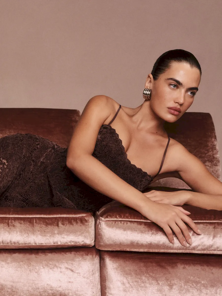 The model is wearing a size 2 and is 5’9.5″, 25″ waist, 36″ hips, 34″ bust.