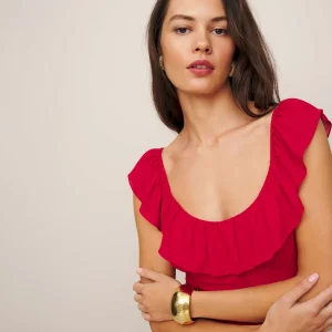 The model is wearing a size 0 and is 5’9″, 24″ waist, 34″ hips, 32″ bust.