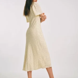The model is wearing a size 2 and is 5’9.5″, 25″ waist, 36″ hips, 34″ bust.