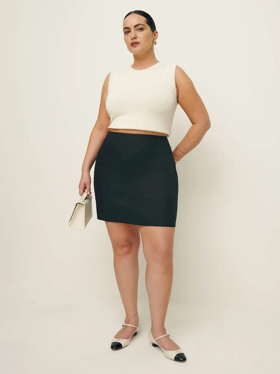 The model is wearing a size 14 and has a 33″ waist, 47″ hips.