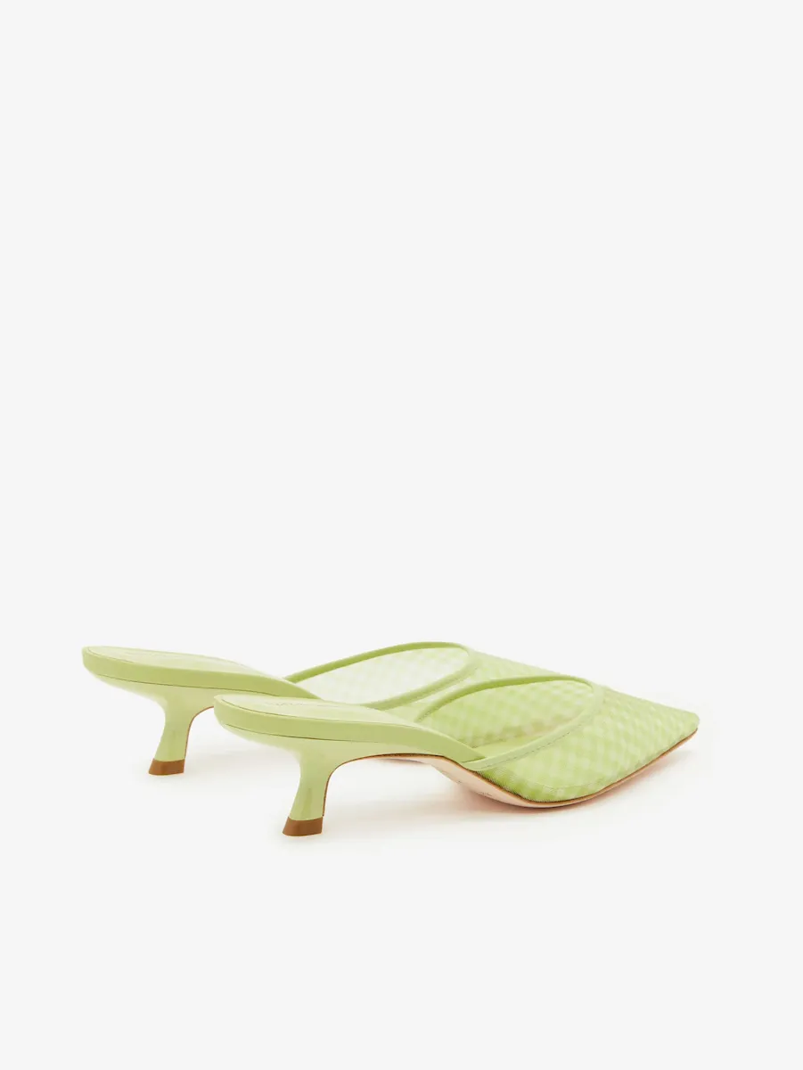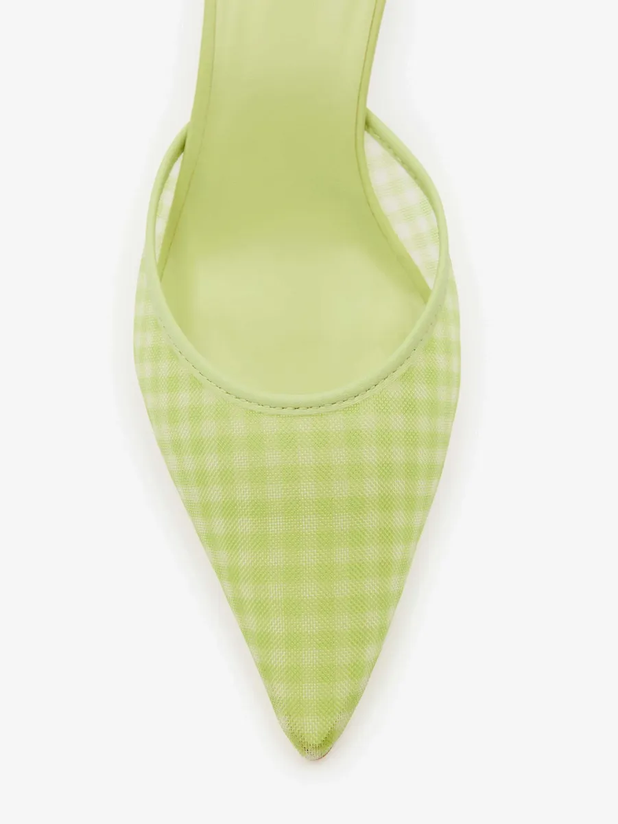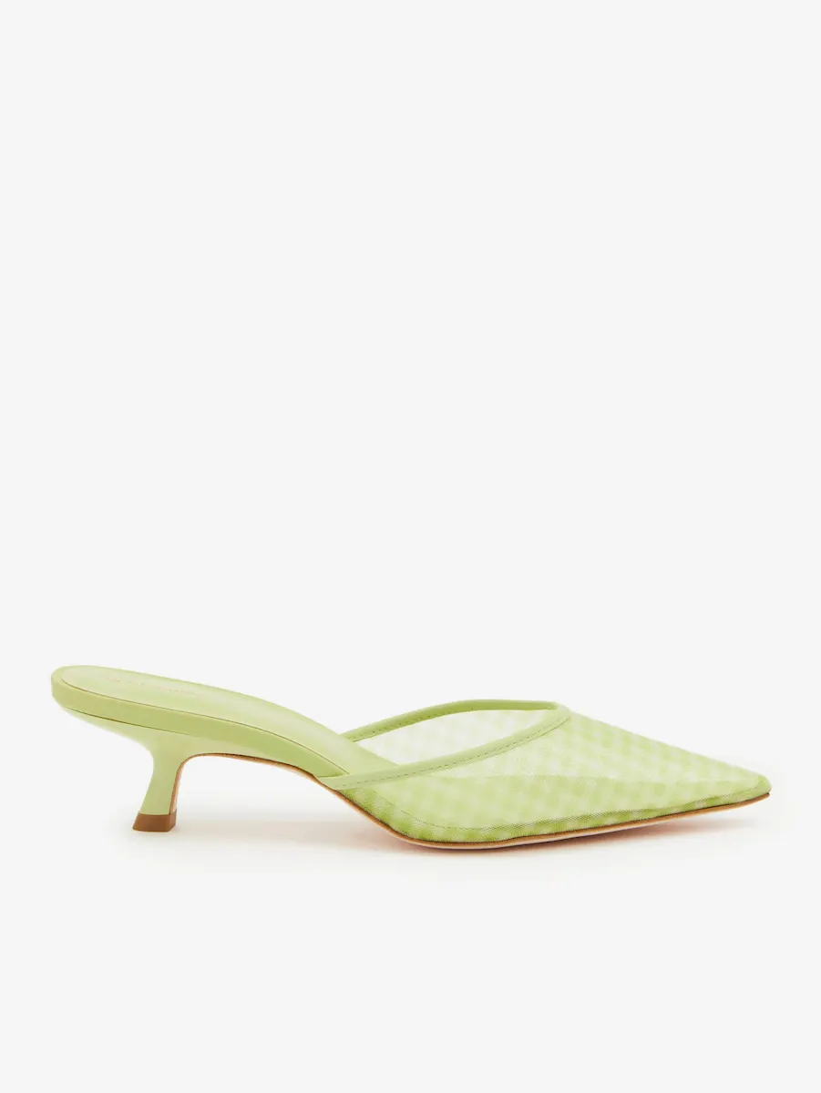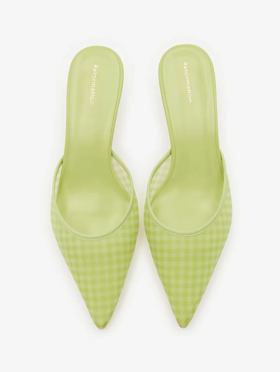 Gingham printed deadstock mesh. Spot clean. More onfabric & care.