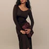 The model is wearing a size XS and is 5’9″, 24″ waist, 34″ hips, 32″ bust.