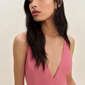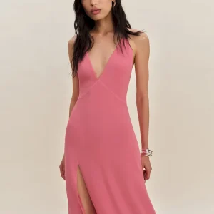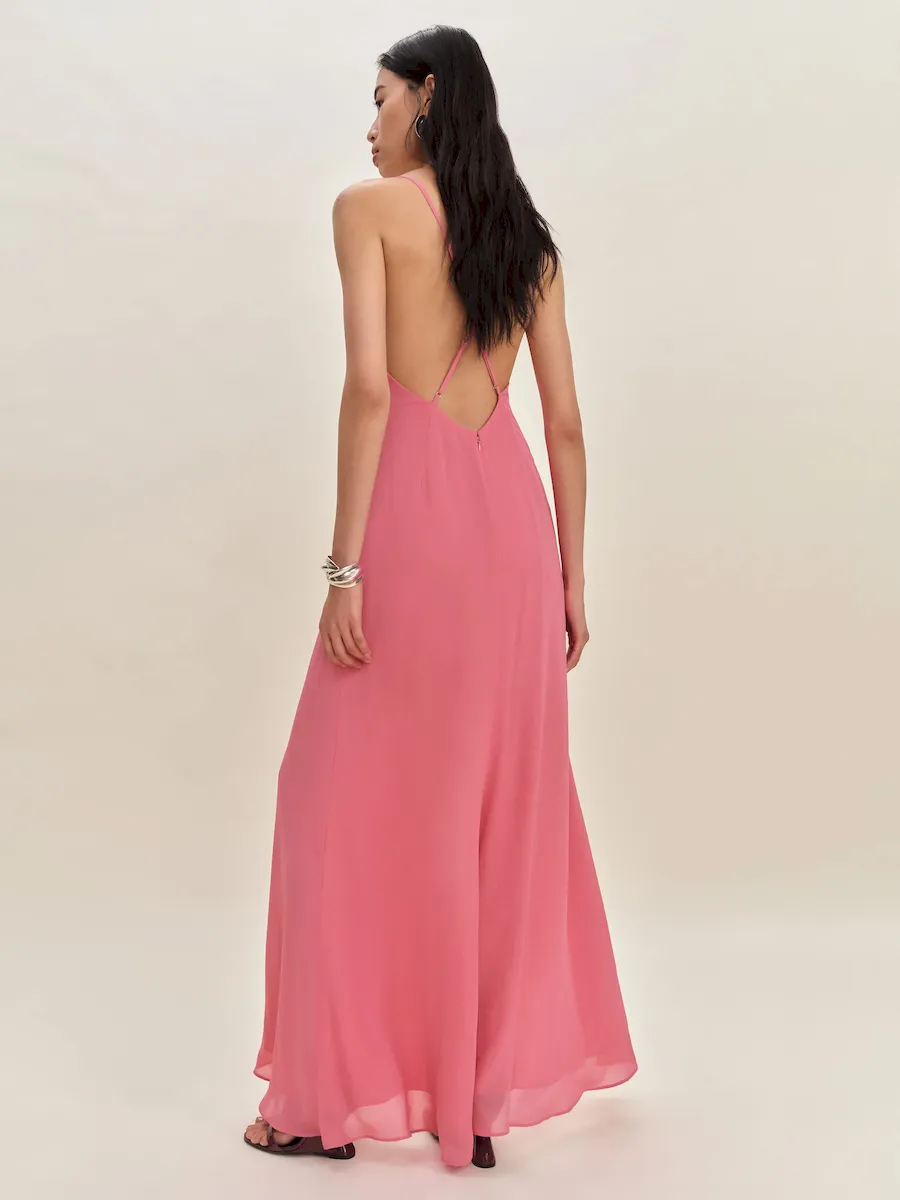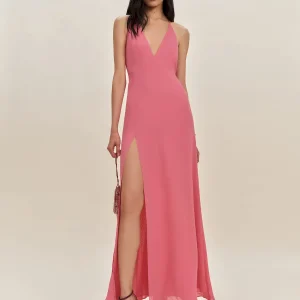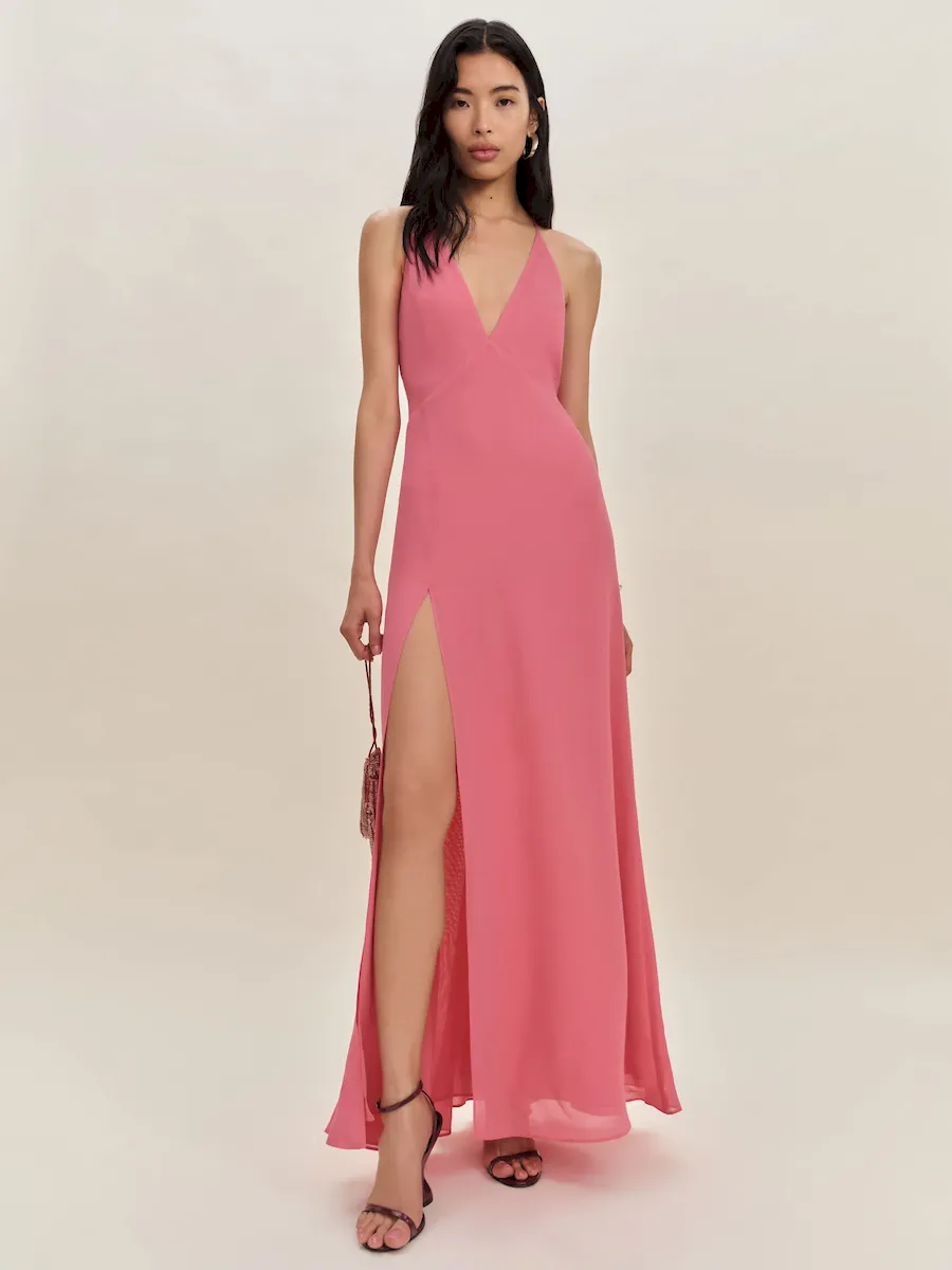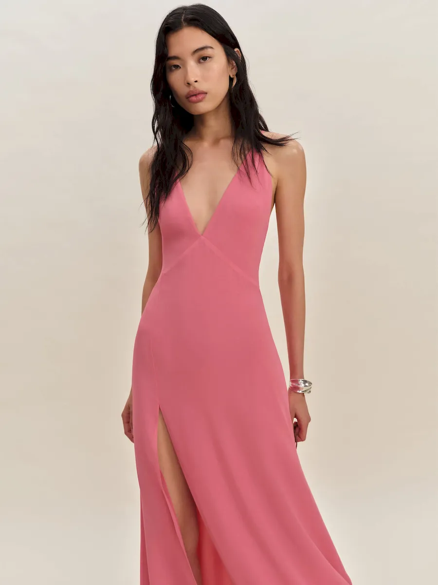 adjustable straps, deep v neck, side slit.