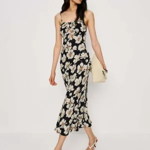 The model is wearing a size XS and is 5’9″, 24″ waist, 34″ hips, 30″ bust.